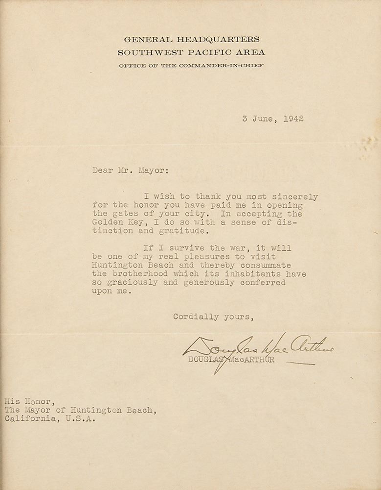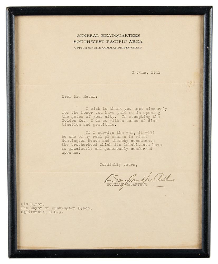 World War II-dated TLS from Douglas MacArthur, one page, 7.75 x 9.75, General Headquarters, Southwest Pacific Area, Office of the Commander-in-Chief letterhead, June 3, 1942. Letter to the Mayor of Huntington Beach, California, in full: "I wish to thank you most sincerely for the honor you have paid me in opening the gates of your city. In accepting the Golden Key, I do so with a sense of distinction and gratitude. If I survive the war, it will be one of my real pleasures to visit Huntington Beach and thereby consummate the brotherhood which its inhabitants have so graciously and generously conferred upon me." Framed and in fine condition.