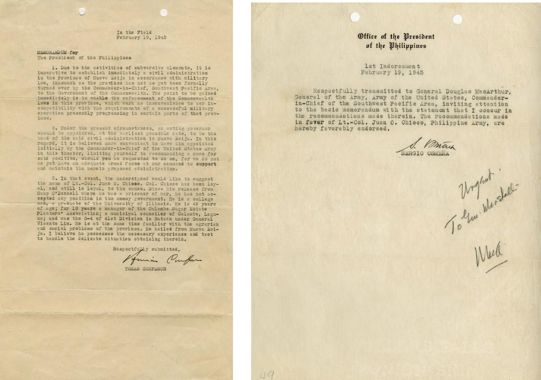 Typed letter signed by War time President of the Philippines, Sergio Osmeña, with additional autograph note signed by Douglas MacArthur. Single page, quarto, dated 19 February 1945, on “Office of the President of the Philippines” letterhead. Document endorsing an appointment recommendation transmitted to General Douglas MacArthur. In part: “...Respectfully transmitted to General Douglas MacArthur, General of the Army, Army of the United States, Commander-in-Chief of the Southwest Pacific Area, inviting attention to the basic memorandum with the statement that I concur in the recommendations made therein. The recommendations made in favor of Lt.-Col. Juan O. Chioco, Philippine Army, are hereby favorably endorsed. / Sergio Osmeña.” Just beneath MacArthur adds in pencil, “Urgent, To Gen. Marshall, “MacA.” Osmeña’s endorsement of Lt.-Col. Chioco comes after receiving the included memorandum from Tomas Confesor. Typed letter signed from Tomas Confesor, Philippine patriot and wartime governor of Free Panay and Roblon, addressed “Memorandum for the President of the Philippines,” Confesor writes in part: “...The point to be gained immediately is to enable the enforcement of the Commonwealth laws in this province, which work no inconvenience to nor incompatibility with the requirements of a successful military operation presently progressing in certain parts of that province...the undersigned would like to suggest the name of Lt.-Col. Juan O. Chioco...He is at the same time familiar with the agrarian and social problems of the province. He hailed from Nueva Ecija. I believe he possesses the necessary experience and tact to handle the delicate situation obtaining therein, Respectfully submitted, Tomas Confesor.” Following the defeat of Japanese forces in the Battle of Leyte, General MacArthur sent his forces into Luzon in January, 1945 with the goal of liberating the remaining Philippines. On 6 February, MacArthur issued the first order for operations in the southern Philippines, code-named VICTOR, with the objective of isolating the islands of Panay, Negros, Cebu, and Bohol, and expanding the range of Allied air operations. While Filipino guerrillas controlled much of the countryside on the four islands, 30,000 Japanese troops held the vital coastal towns, including Cebu City and Iloilo on Panay. Beyond his immediate desire to clear the Japanese from the islands, MacArthur envisioned these two port cities as important staging areas for the expected influx of troops scheduled to invade Japan. The Joint Chiefs of Staff had told MacArthur to be prepared to stage twenty-two divisions for the invasion of Japan at Philippine bases by November, 1945, with eleven more to follow by the next February. MacArthur’s urgent notation to U.S. Army Chief of Staff General George C. Marshall stresses the importance of establishing security during the tense opening weeks of hostilities. Important documents relating to Philippine liberation and the establishment of the Government of the Commonwealth. Documents signed by Osmeña and MacArthur are uncommon. Original binder holes at the head, otherwise fine condition.
