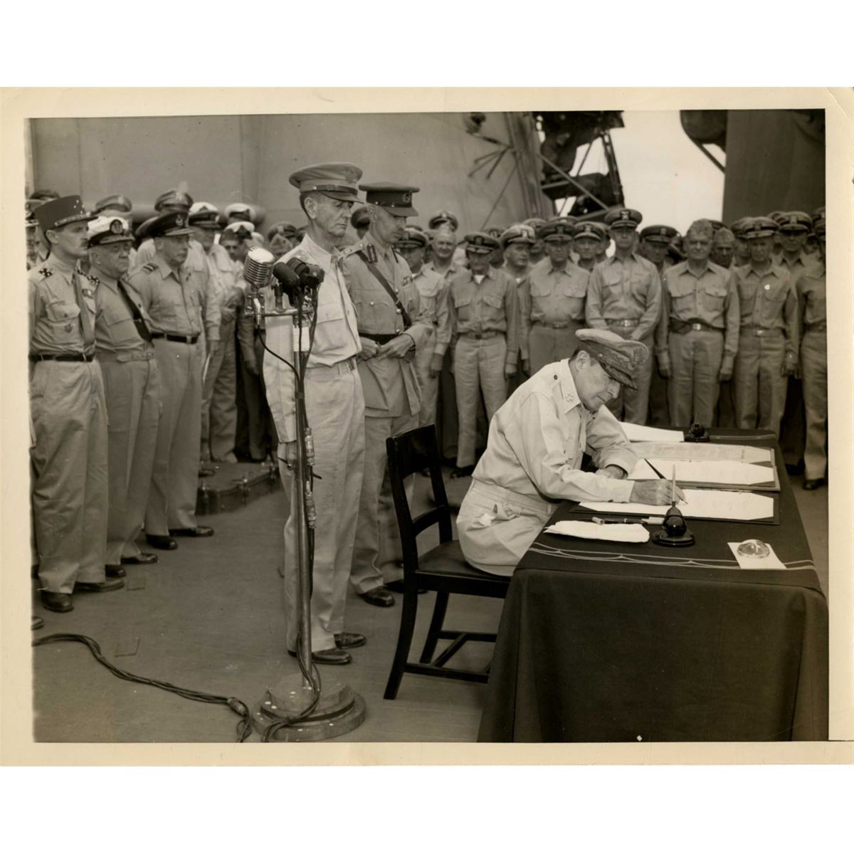 4 September 1945 AP Press Photo of General Douglas MacArthur Signing the Japanese Surrender Papers -- 9'' x 7'' -- Very Good