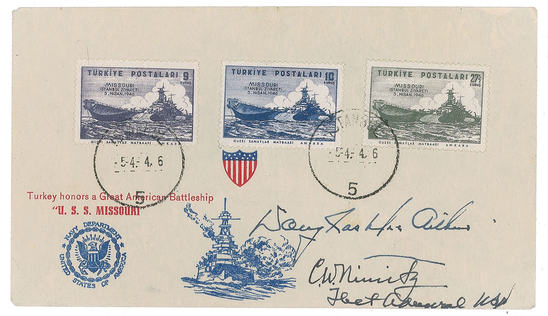 Turkish commemorative cover with a cachet honoring the USS Missouri, signed in fountain pen by American heroes of World War II, "Douglas MacArthur" and "C. W. Nimitz, Fleet Admiral USN." In fine condition.
