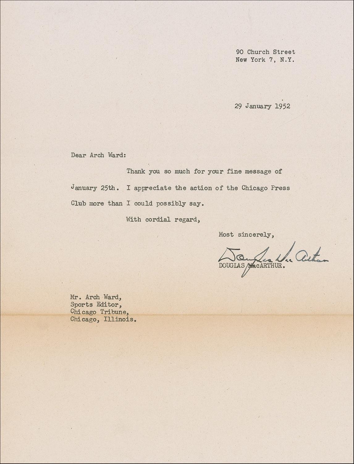 TLS, one page, 8 x 10.5, January 29, 1952. Short letter of thanks to the Sports Editor of the Chicago Tribune. In full: “Thank you so much for your fine message of January 25th. I appreciate the action of the Chicago Press Club more than I could possibly say.” Intersecting folds, and some toning to lower portion of page, which could be matted out, otherwise fine condition.