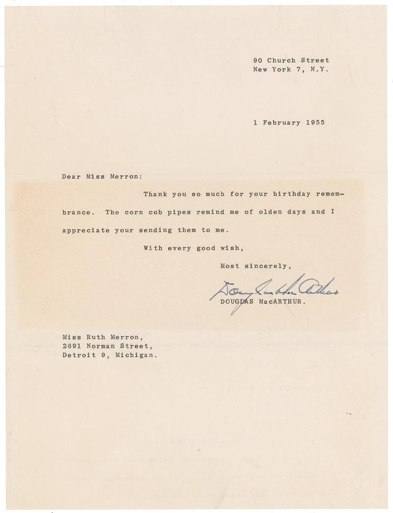 TLS, one page, 8 x 10.5, February 1, 1955. Letter of thanks for a birthday gift. In full: “Thank you so much for the birthday remembrance. The corn cob pipes remind me of olden days and I appreciate you sending them to me.” Scattered light wrinkles and creases, and a mild block of toning over text and signature from previous display, otherwise fine condition.