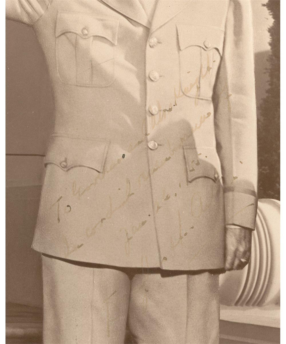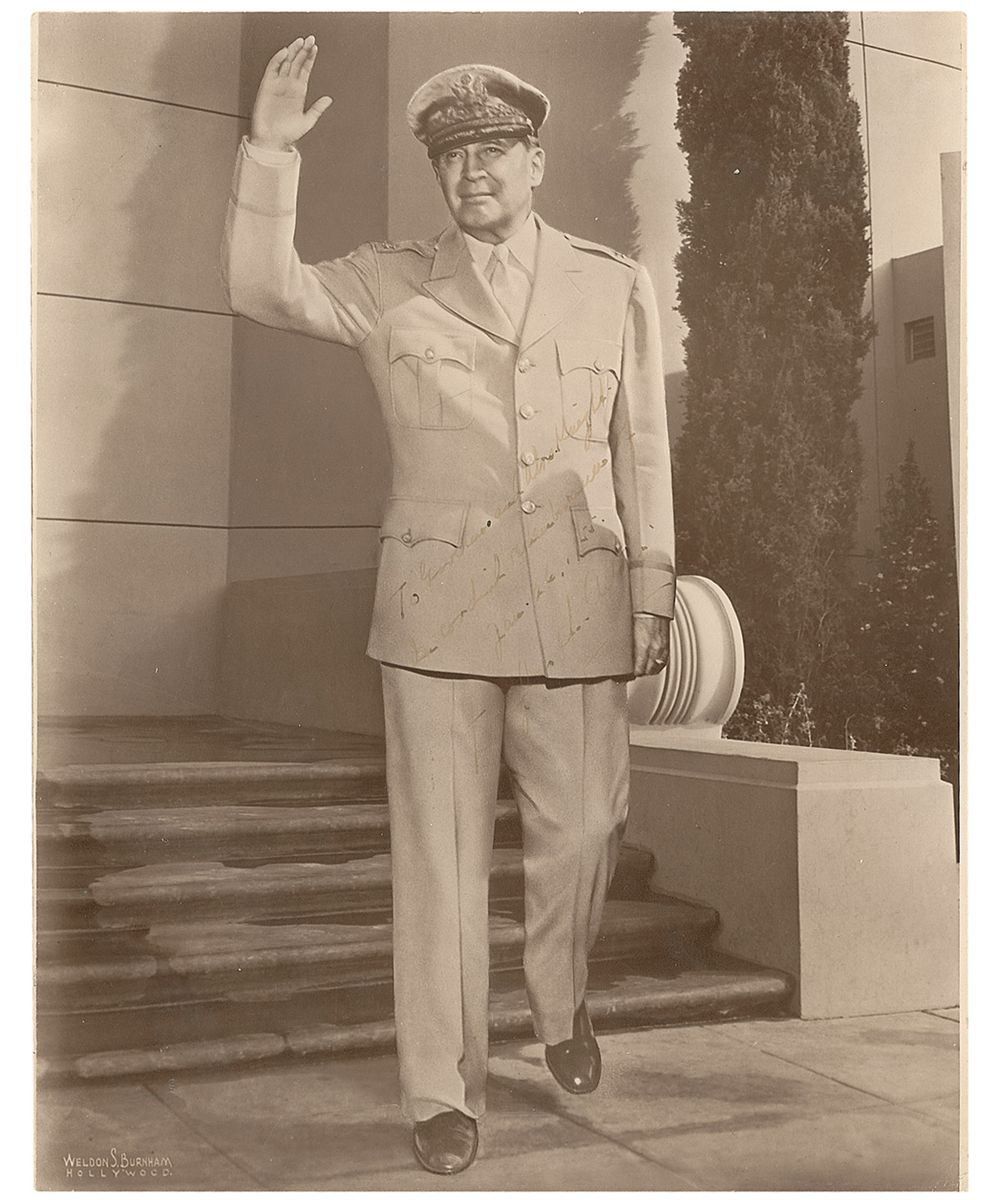 Vintage matte-finish 10.75 x 13.75 full-length Weldon Burnham portrait of MacArthur waving as he exits a building, signed and inscribed in fountain pen to former California governor Goodwin Knight, “To Governor and Mrs. Knight, In cordial remembrance of Jan. 26, 1955, Douglas MacArthur.” Photo is affixed to a slightly larger brown board. In very good condition, with signature and inscription moderately faded and light, but still mostly legible, trimmed edges, and some light discoloration from adhesive on reverse. Accompanied by two ALSs from MacArthur’s wife Jean.