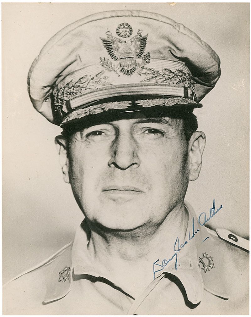 Vintage 7.5 x 9.5 head-and-shoulders photo, signed in fountain pen, “Douglas MacArthur.” Photo is affixed to an identical size board. Trimmed edges and a few light surface dings and creases, otherwise fine condition.