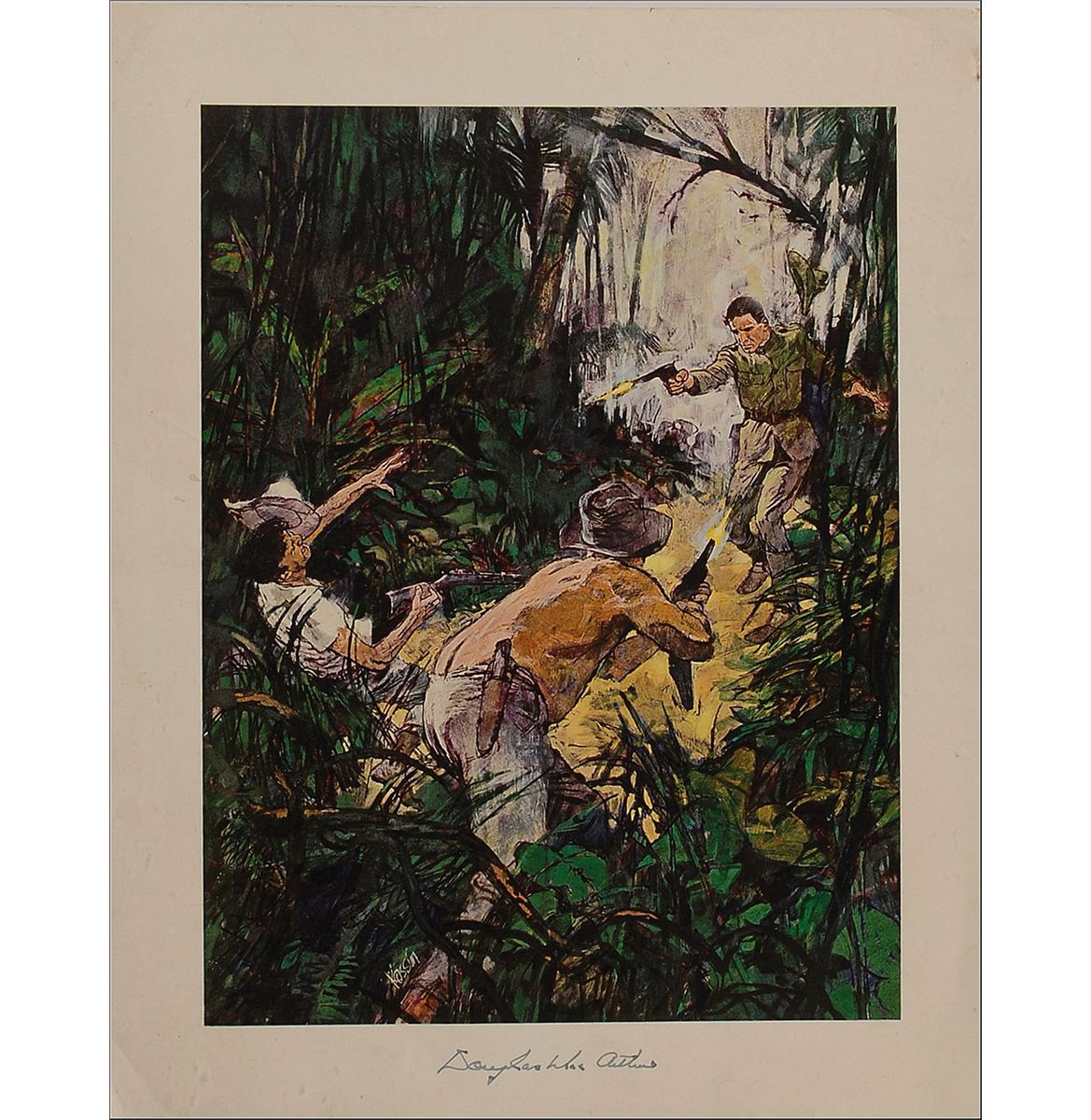 Riveting color 13.75 x 17 print of an oil painting depicting a battle reenactment from MacArthur’s early military career in the Philippines, affixed by its top edge to a cardstock mount of the same size, signed in the bottom border in ink. In very good condition, with scattered light toning, surface marks, and dings, and a few trivial tears to the right edge. Accompanied by a January 1964 copy of Life magazine, featuring a copy of the print and an article.