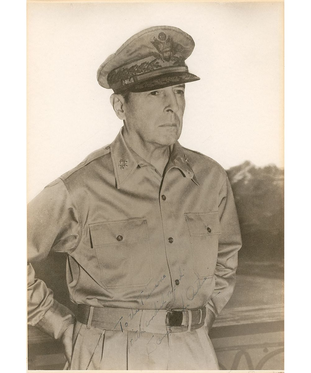Commanding vintage matte-finish 9 x 13 photo of MacArthur, signed and inscribed in fountain pen, “To Mr. Timmons, with cordial regard, Douglas MacArthur.” Affixed to a slightly larger mount. Lightly trimmed edges, and the inscription and signature faded but legible, otherwise fine condition.