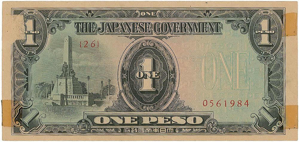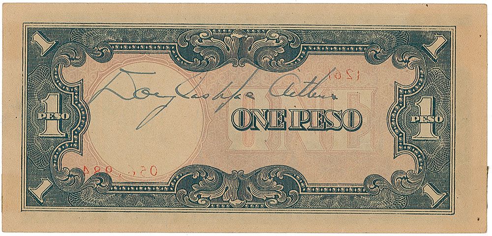 Original 1942 Japanese government-issued Philippine Peso banknote, neatly signed on the reverse in fountain pen, “Douglas MacArthur.” In fine condition, with three small pieces of toned tape affixed to the obverse (not affecting the appearance of the signed side). An uncommon and especially interesting format, as these were often used as propaganda leaflets by Allied forces, who printed messages on them and dropped them over occupied areas.