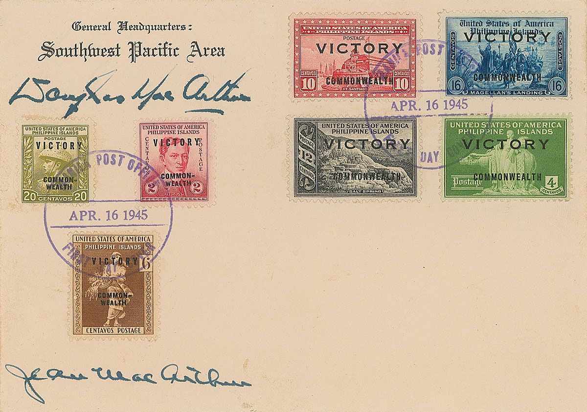 FDC, 6.5 x 4.5, one of MacArthur’s General Headquarters South Pacific Area envelopes, with all seven “Victory” overprinted stamps postmarked, “Manila Post Office, Apr. 16 1945, First Day Cover,” signed in the upper left in fountain pen, “Douglas MacArthur,” and also signed by his wife Jean. In fine condition.