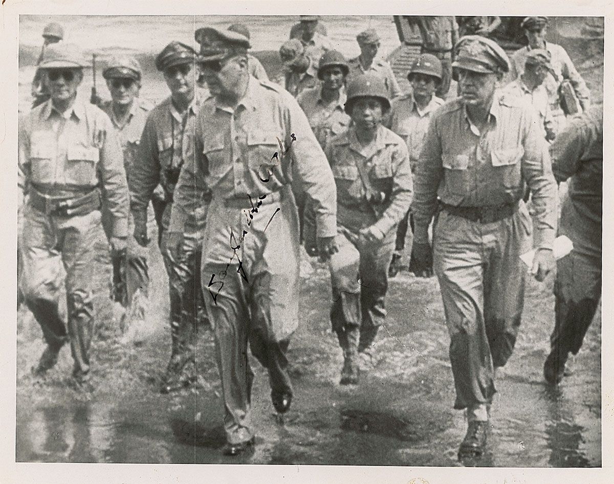Vintage glossy 9 x 7 photo of MacArthur coming ashore on the island of Leyte in the Phillipines, signed vertically in fountain pen. Some scattered light surface marks and light irregular ink adhesion to portions of signature, as well as a few letters a shade or two light, and some mounting remnants to reverse, otherwise fine condition.