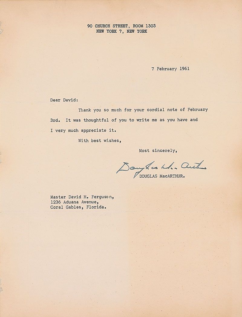 TLS, one page, 8 x 10.5, personal letterhead, February 7, 1961. Letter to an admirer. In part: “Thank you so much for your cordial note…It was thoughtful of you to write me.” In fine condition, with a light block of toning to the lower right quarter of the page. Accompanied by the original mailing envelope.
