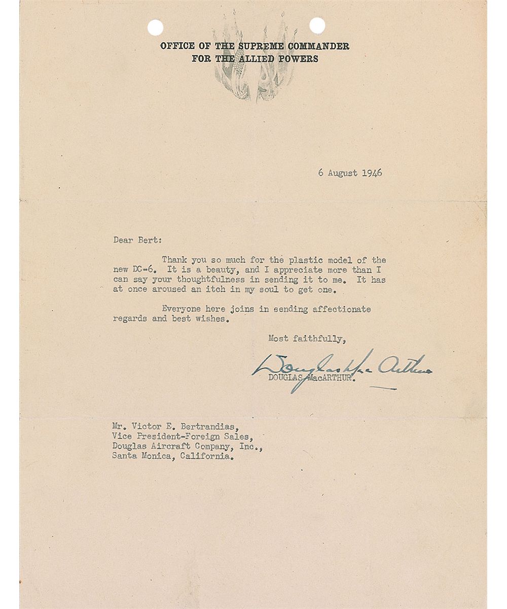 TLS, one page, 8 x 10.5, Supreme Commander for the Allied Powers letterhead, August 6, 1946. Letter to a Douglas Aircraft executive. In part: “Thank you so much for the plastic model of the new DC-6. It is a beauty…It has at once aroused an itch in my soul to get one.” In fine condition, with intersecting folds and two punch holes to the top.