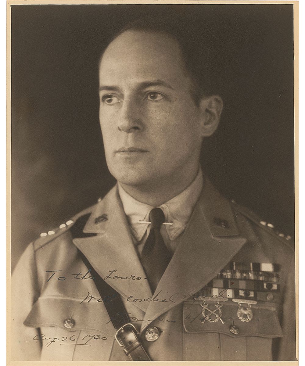 Early vintage matte-finish 8 x 10 photo of MacArthur in full dress uniform, signed and inscribed in fountain pen “To the Lours, with cordial regards, Douglas MacArthur, Aug 26, 1930.” Fair to poor contrast to signature, otherwise fine condition. Less than three months after signing this photo, MacArthur would be sworn in as Chief of Staff of the United States Army, with the rank of General. Signed photos of MacArthur from this period in his career are uncommon.