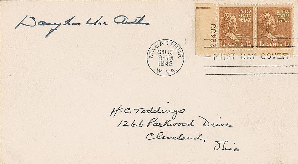 FDC, bearing a MacArthur, West Virginia, postmark, signed in the upper left in black ink, “Douglas MacArthur.” In fine condition.