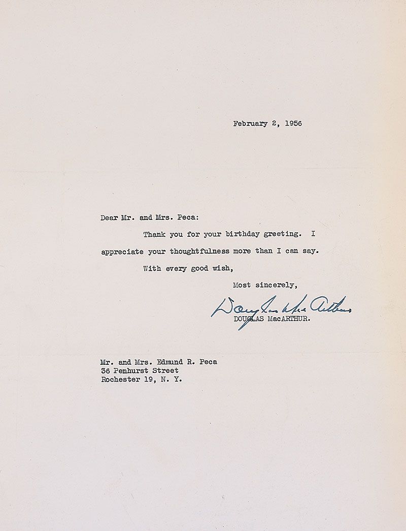 TLS, one page, 8 x 10.5, February 2, 1956. Letter to well-wishers. In part: “Thank you for your birthday greeting. I appreciate your thoughtfulness more than I can say.” In fine condition.