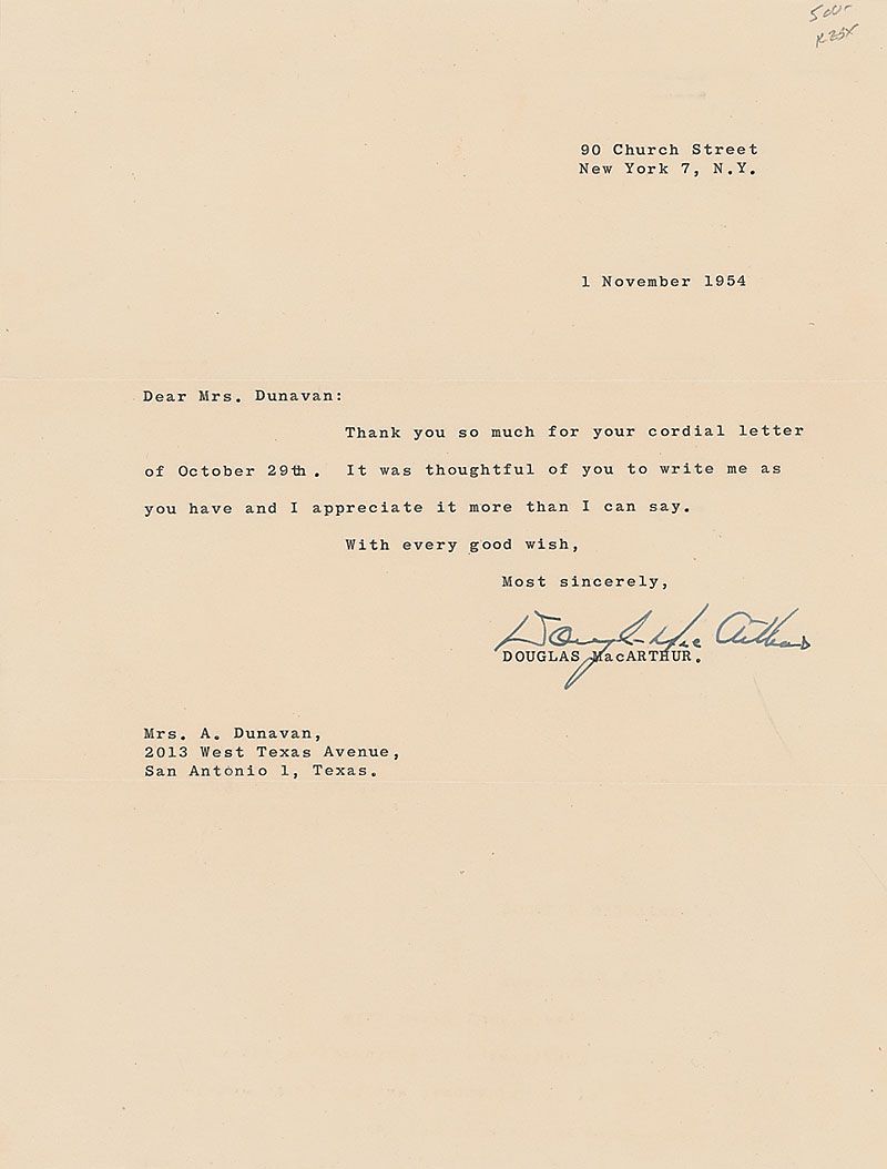 TLS, one page, 8 x 10.25, November 1, 1954. Letter of thanks to an admirer. In full: “Thank you so much for your cordial letter of October 29th. It was thoughtful of you to write me as you have and I appreciate it more than I can say.” In fine condition. Accompanied by the original Department of the Army ‘penalty’ mailing envelope.
