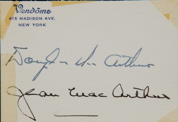 Vintage ink signature, “Douglas MacArthur,” and his wife "Jean MacArthur" on an off-white 4.5 x 2.5 card. In good condition, with toning and soiling to borders and a clear piece of tape affixed over the first letter of both signatures.