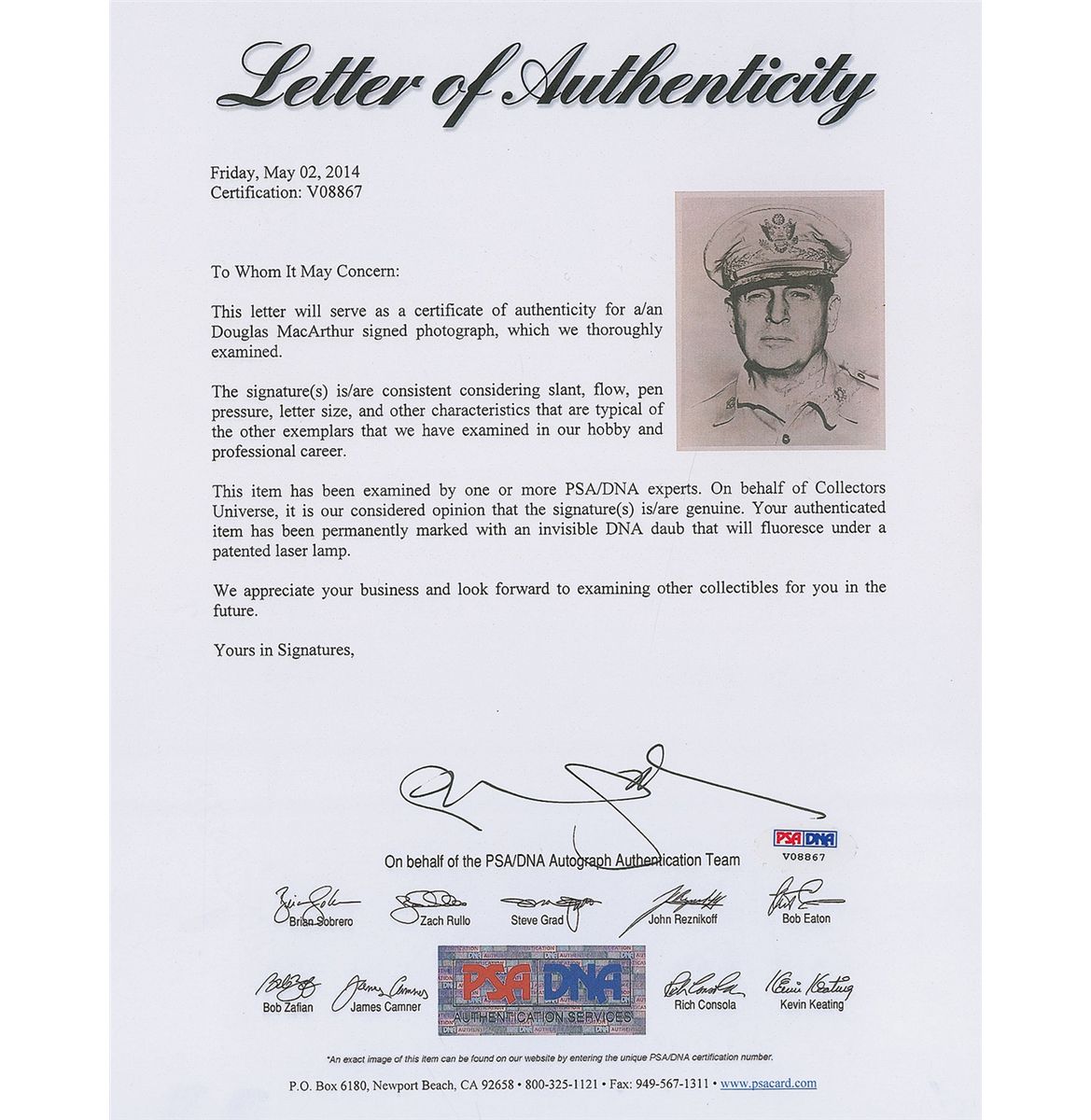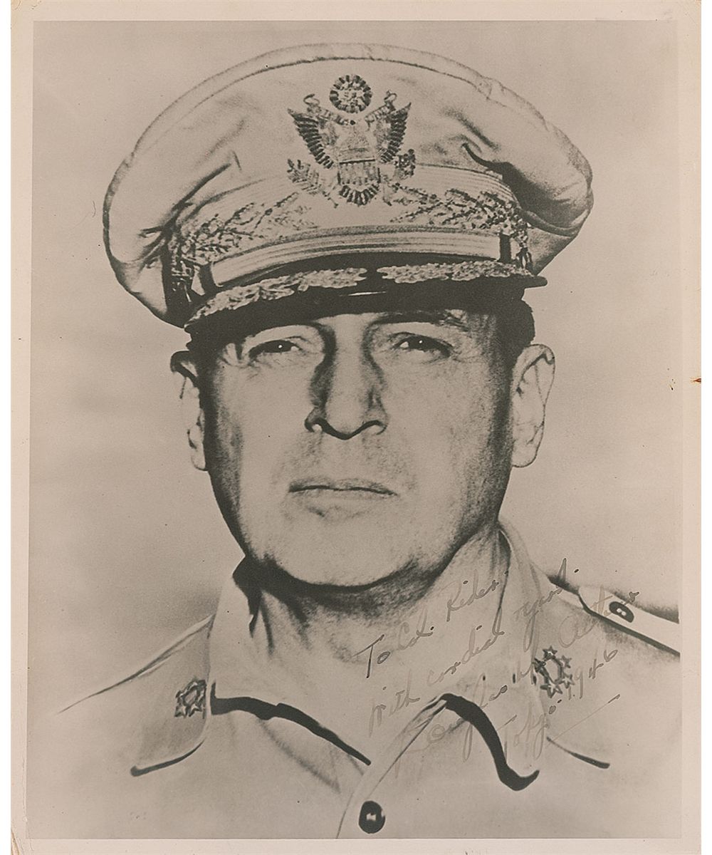 Desirable matte-finish 8 x 10 portrait of MacArthur in uniform, signed and inscribed in fountain pen, “To Col. Rider, with cordial regard, Douglas MacArthur, Tokyo—1946.” Corner tip creases and inscription and signature light but legible, otherwise fine condition. After WWII, MacArthur’s headquarters were located in Tokyo, where he helped Japan to rebuild itself following the devastation of war; overseeing this redevelopment, MacArthur was effectively the interim leader of Japan from 1945 until 1948. Accompanied by a full letter of authenticity from PSA/DNA.