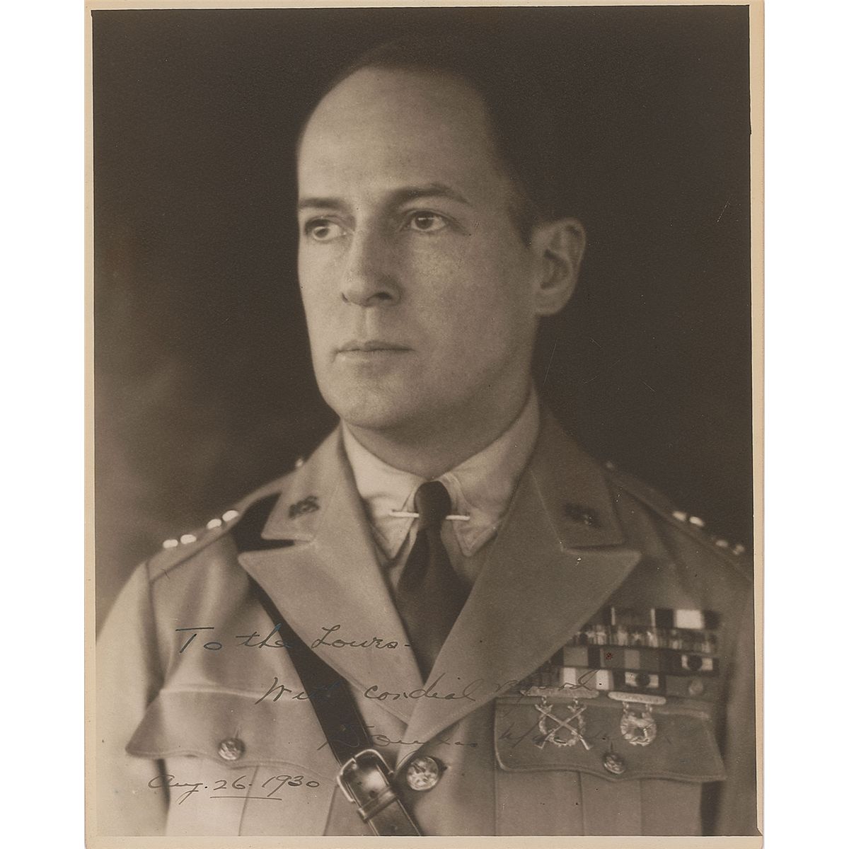 Early matte-finish 8 x 10 photo of MacArthur in full dress uniform, signed and inscribed in fountain pen, “To the Lours, with cordial regards, Douglas MacArthur, Aug 26, 1930.” In fine condition, with light contrast to signature against the busy background of his uniform. Less than three months after signing this photo, MacArthur would be sworn in as Chief of Staff of the United States Army, with the rank of General. Signed photos of MacArthur from this period in his career are uncommon.
