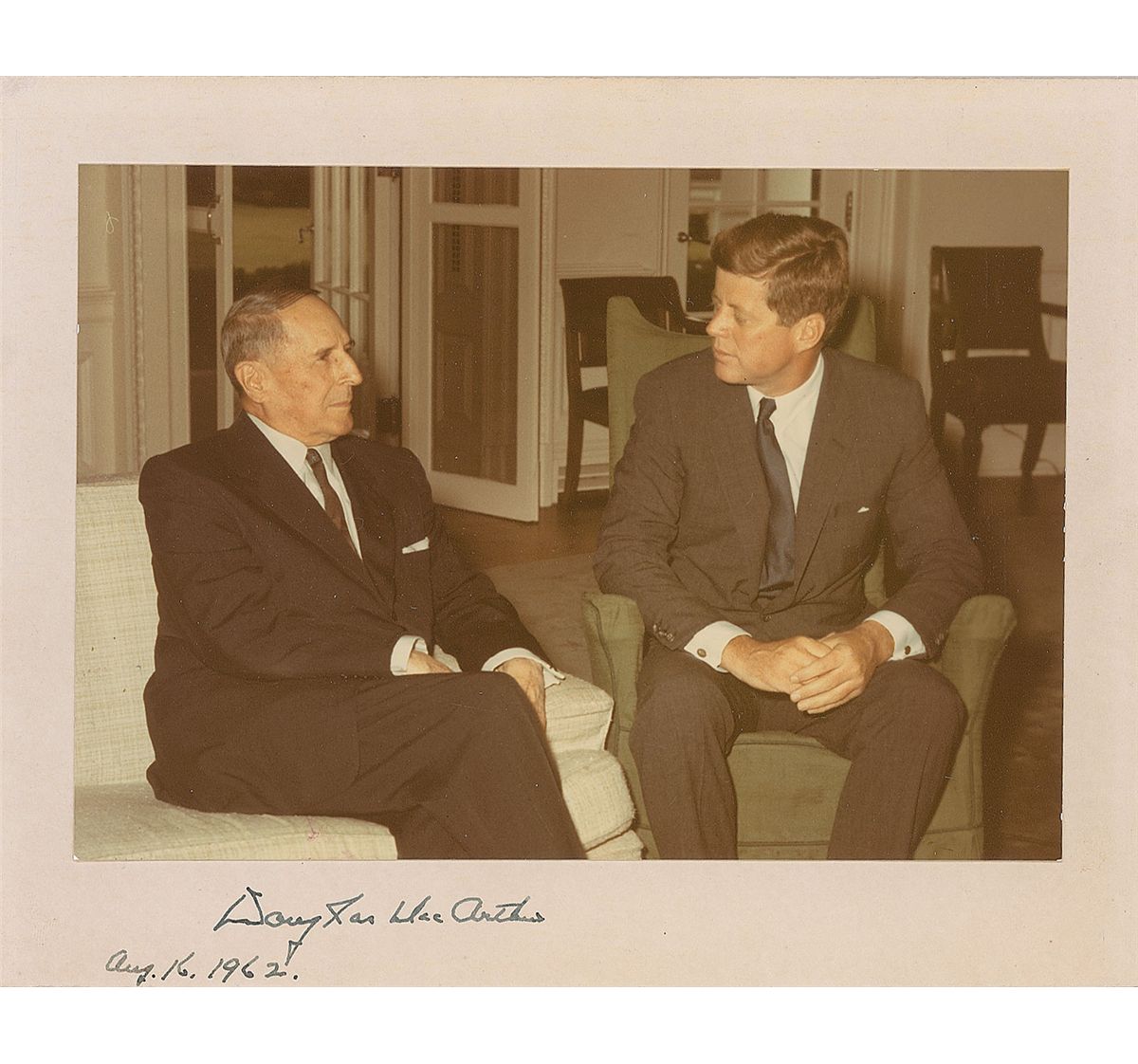 Color matte-finish 8.5 x 6 photo of MacArthur and President John F. Kennedy meeting together, affixed to a 10 x 8 mount, signed on the mount in fountain pen, “Douglas MacArthur, Aug. 16, 1962.” In fine condition, with trimmed edges to the mount.
