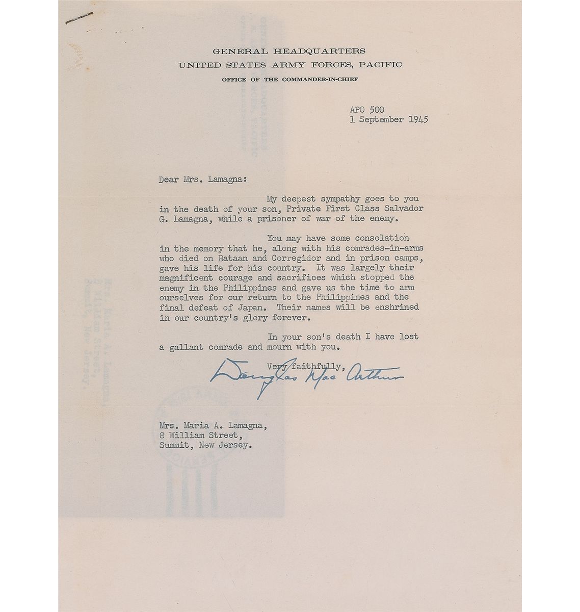 TLS, one page, 8 x 10.5, General Headquarters, United States Army Forces, Pacific letterhead, September 1, 1945. Letter to Maria A. Lamagna. In full: “My deepest sympathy goes to you in the death of your son, Private First Class Salvador G. Lamagna, while a prisoner of war of the enemy. You may have some consolation in the memory that he, along with his comrades-in-arms who died on Bataan and Corregidor and in prison camps, gave his life for his country. It was largely their magnificent courage and sacrifices which stopped the enemy in the Philippines and gave us the time to arm ourselves for our return to the Philippines and the final defeat of Japan. Their names will be enshrined in our country’s glory forever. In your son’s death I have lost a gallant comrade and mourn with you.” The original mailing envelope is stapled to the upper left. In fine condition. Salvador G. Lamagna served in the 31st Infantry Regiment, which surrendered to the Japanese on April 9, 1942. The men in the unit were taken as prisoners of war, most undergoing brutal torture and humiliation on the Bataan Death March; roughly half of the 1600 members of the 31st Infantry who surrendered at Bataan perished while prisoners of the Japanese.