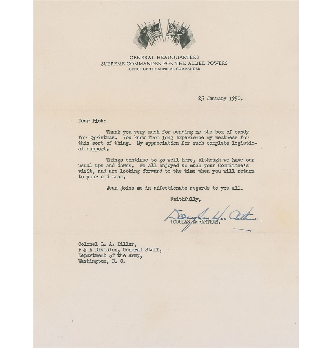 TLS, one page, 8 x 10.5, General Headquarters, Supreme Commander for the Allied Powers letterhead, January 25, 1950. Letter to Colonel Legrande A. Diller. In part: “Thank you very much for sending me the box of candy for Christmas. You know from long experience my weakness for this sort of thing. My appreciation for such complete logistical support. Things continue to go well here, although we have our usual ups and downs. We all enjoyed so much your Committee's visit, and are looking forward to the time when you will return to your old team.” In fine condition. Accompanied by the original mailing envelope.