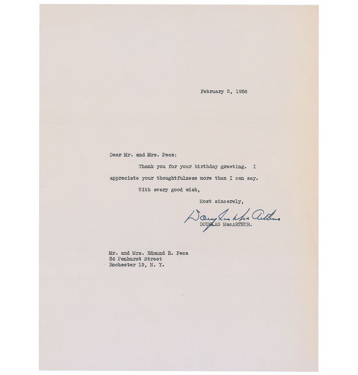 TLS, one page, 8 x 10.5, February 2, 1956. Letter to Mr. and Mrs. Edmund Peca, in full: “Thank you for your birthday greeting. I appreciate your thoughtfulness more than I can say.” In fine condition, with a few trivial tears to edges and a faint diagonal crease to right side.