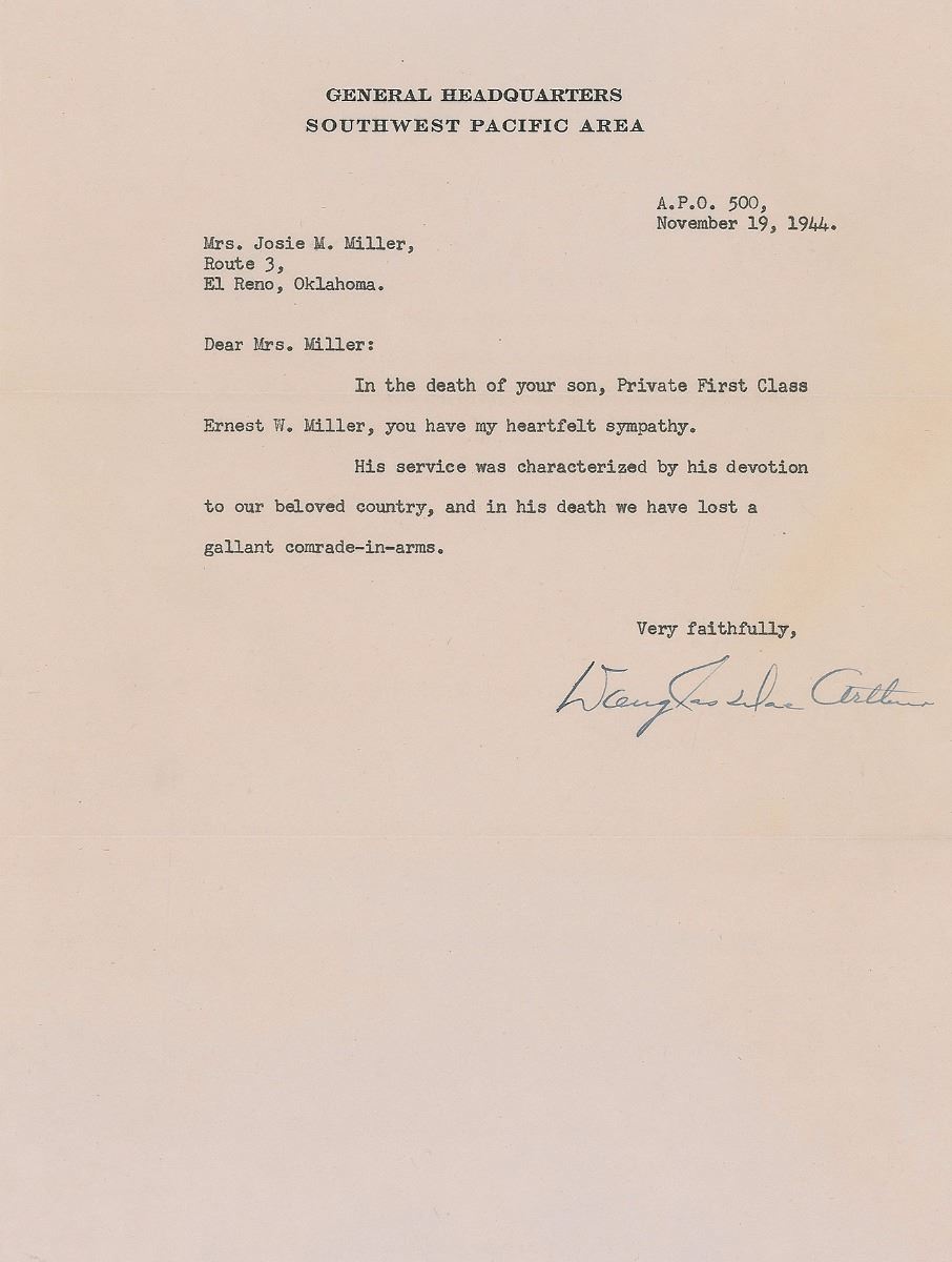 World War II-dated TLS, one page, 8 x 10.5, General Headquarters, Southwest Pacific Area letterhead, November 19, 1944. Letter of condolences to Josie M. Miller, in full: “In the death of your son, Private First Class Ernest W. Miller, you have my heartfelt sympathy. His service was characterized by his devotion to our beloved country, and in his death we have lost a gallant comrade-in-arms.” In fine condition, with a few trivial creases.