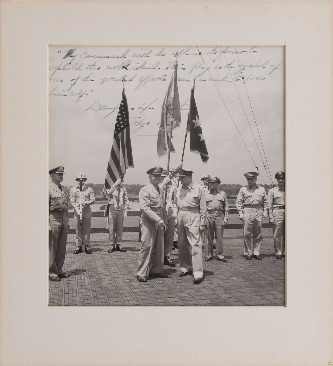 Unique vintage matte-finish 7.5 x 8.75 photo of General MacArthur receiving the United Nations flag from US Chief of Staff J. Lawton Collins to fly over his Tokyo headquarters during the Korean War, signed in fountain pen, “‘My command will do all in its power to uphold this noble ideal. This flag is the symbol of one of the greatest efforts man has made to free himself.’ Douglas MacArthur, Tokyo—1950.” Matted and permanently mounted. In very good to fine condition, with some surface loss and adhesive remnants to borders underneath mat.