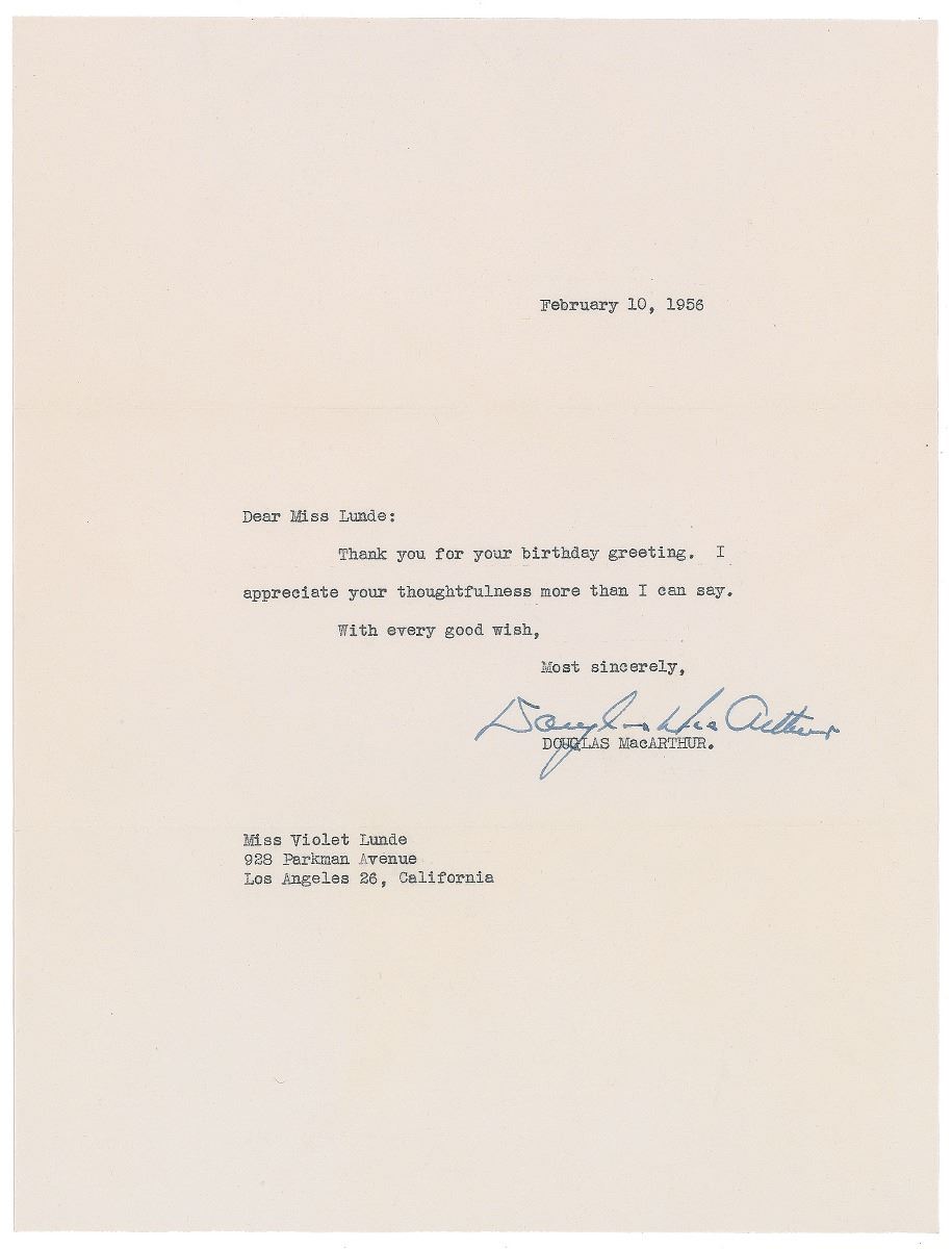 TLS, one page, 8 x 10.5, February 10, 1956. Letter to Miss Lunde, in full: “Thank you for your birthday greeting. I appreciate your thoughtfulness more than I can say.” In fine condition. Accompanied by the original mailing envelope.