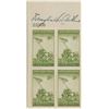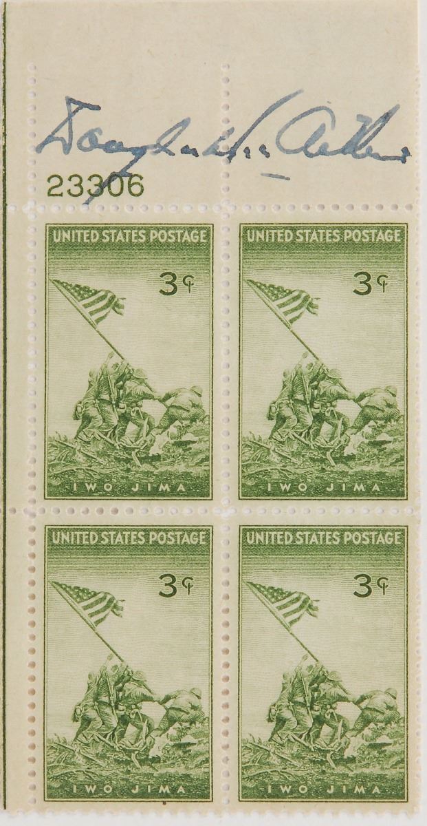 Block of four three-cent US postage stamps depicting the famous flag raising on Iwo Jima, 2 x 4.25, signed in the blank upper margin in fountain pen. In fine condition.