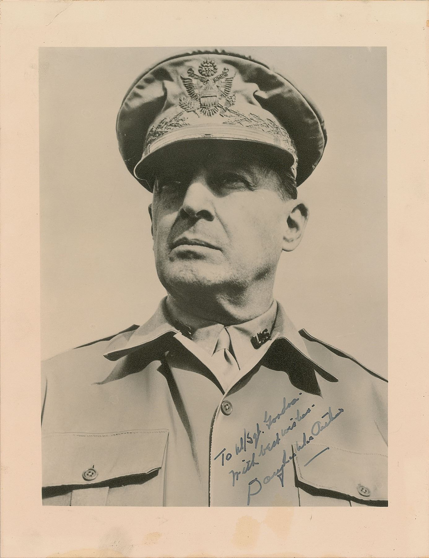 Striking matte-finish 8.5 x 11 portrait of General MacArthur in uniform, signed and inscribed in fountain pen, "To M/Sgt. Gordon, With best wishes, Douglas MacArthur.” In fine condition, with light stains to the bottom border and a short tear to the top border, all of which could be matted out.