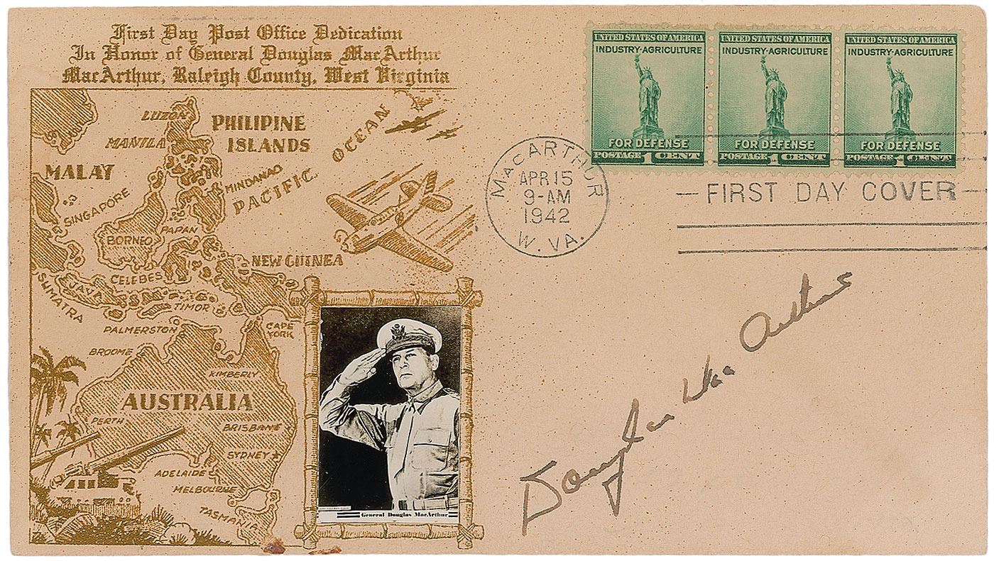 World War II-dated FDC with a cachet honoring General Douglas MacArthur and a small affixed portrait of the general saluting, neatly signed in fountain pen. Cover also bears an April 15, 1942, postmark from MacArthur, West Virginia, and three wartime postage stamps promoting industry and agriculture “for defense.” In fine condition, with overall light toning, two spots of soiling to lower edge, and one trivial crease to upper edge.