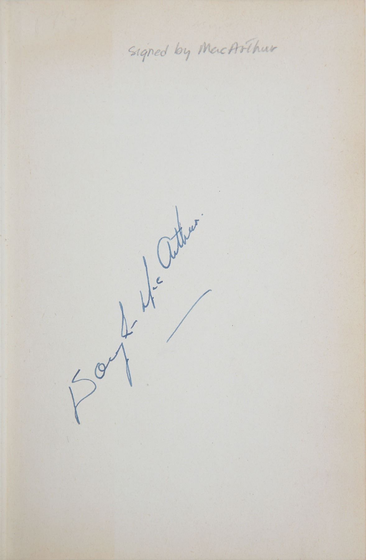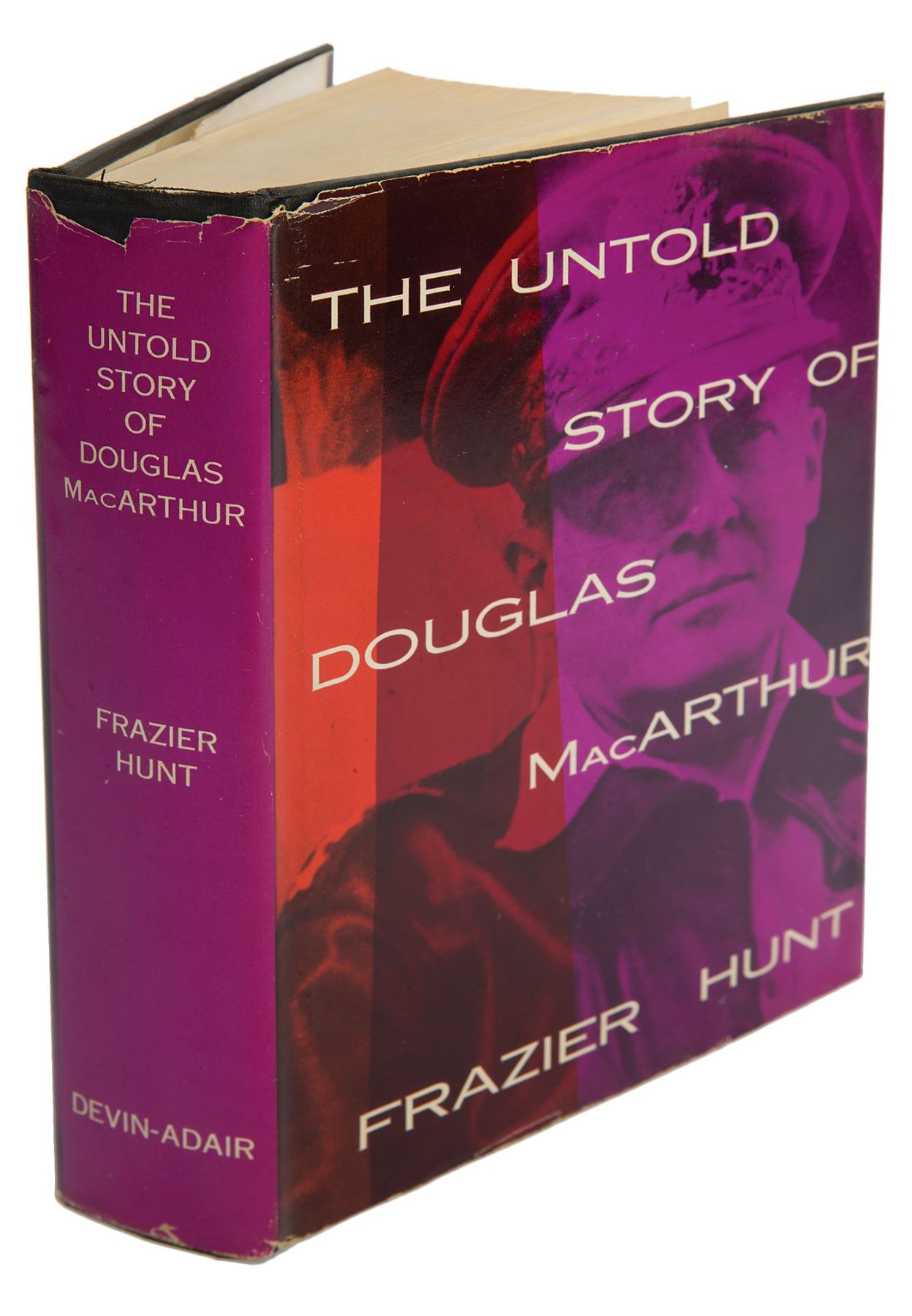 Signed book: The Untold Story of Douglas MacArthur. Second printing. NY: The Devin-Adair Company, 1954. Hardcover with dust jacket, 6 x 8.5, 533 pages. Signed on the first free end page in fountain pen by MacArthur. In fine condition, with minor paper loss to the dust jacket.