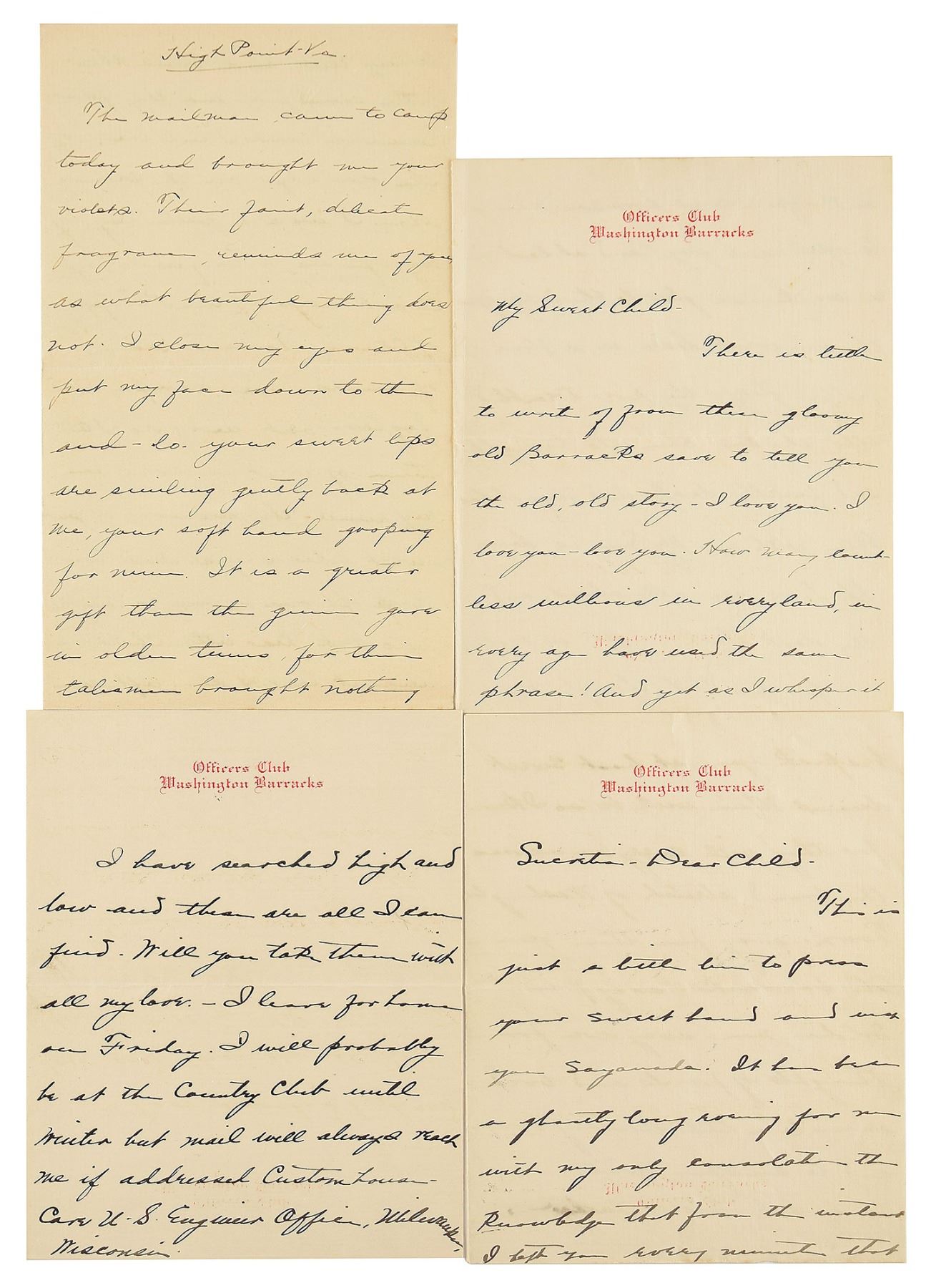 Rare group lot of four handwritten letters from Douglas MacArthur to love interest Lucretia Le Bourgeois, three signed “Douglas” and one unsigned, 11 total pages, dated between April and May 1907.