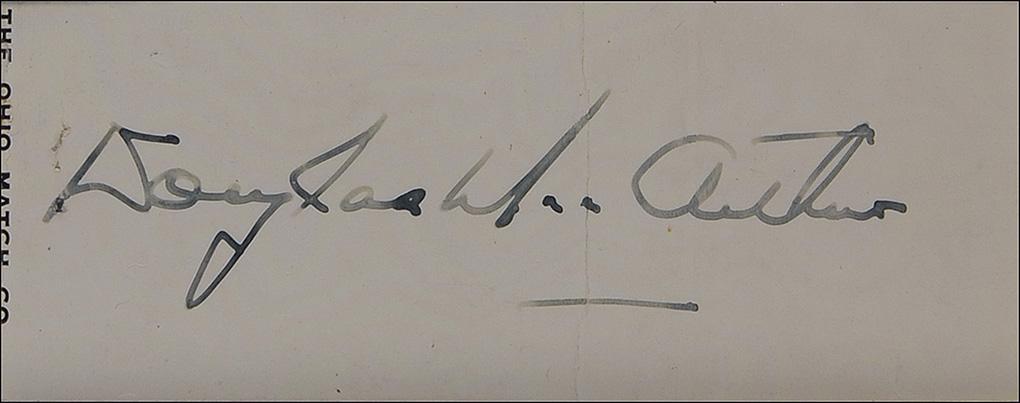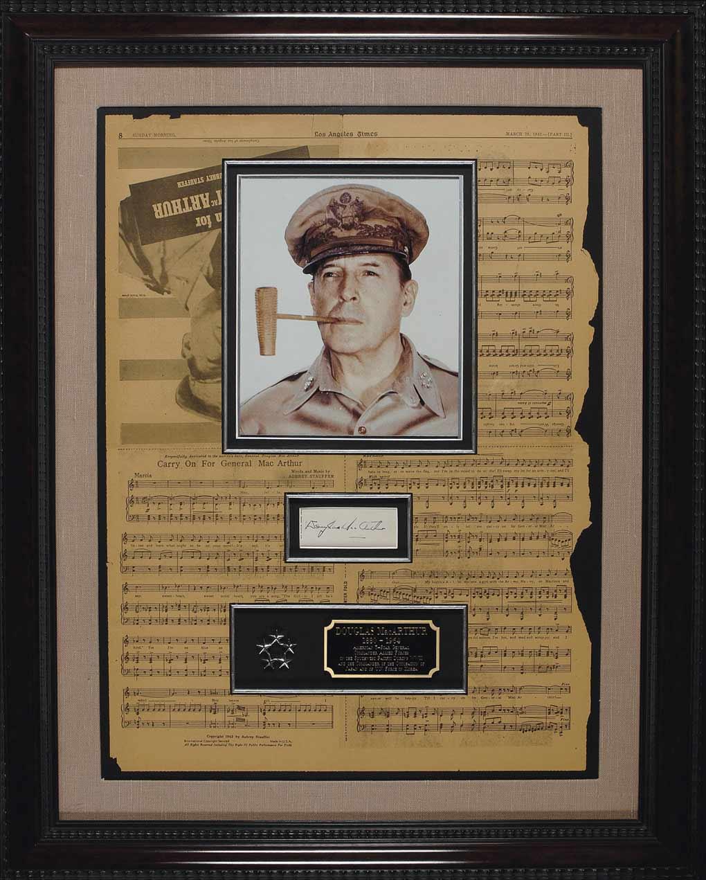 White matchbook, measuring 3.25 x 1.5 opened, signed across the covers in fountain pen by MacArthur. Creatively double matted and framed with a portrait of MacArthur, a name plaque, five-star cluster, and a page from the March 29, 1942 Los Angeles Times with sheet music to “Carry On For General MacArthur,” to an overall size of 24.5 x 30.5. In fine condition, with a couple light vertical creases, lightly affecting a couple letters of signature. Oversized.