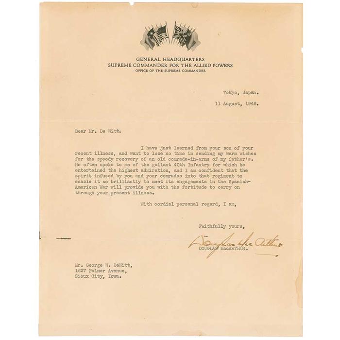 TLS, one page, 8 x 10, General Headquarters, Supreme Commander for the Allied Powers letterhead, August 11, 1948. Letter sending well wishes to a family friend. In full: “I have just learned from your son of your recent illness, and want to lose no time in sending my warm wishes for the speedy recovery of an old comrade-in-arms of my father’s. He often spoke to me of the gallant 40th Infantry for which he entertained the highest admiration, and I am confident that the spirit infused by you and your comrades into that regiment to enable it so brilliantly to meet its engagements in the Spanish-American War will provide you with the fortitude to carry on through your present illness.” Accompanied by the original mailing envelope. In very good condition, with a uniform shade of toning, horizontal fold affecting tops of several letters of signature, a couple of trivial edge chips, and some light damp staining to edges. Pre-certified PSA/DNA and RRAuction COA.
