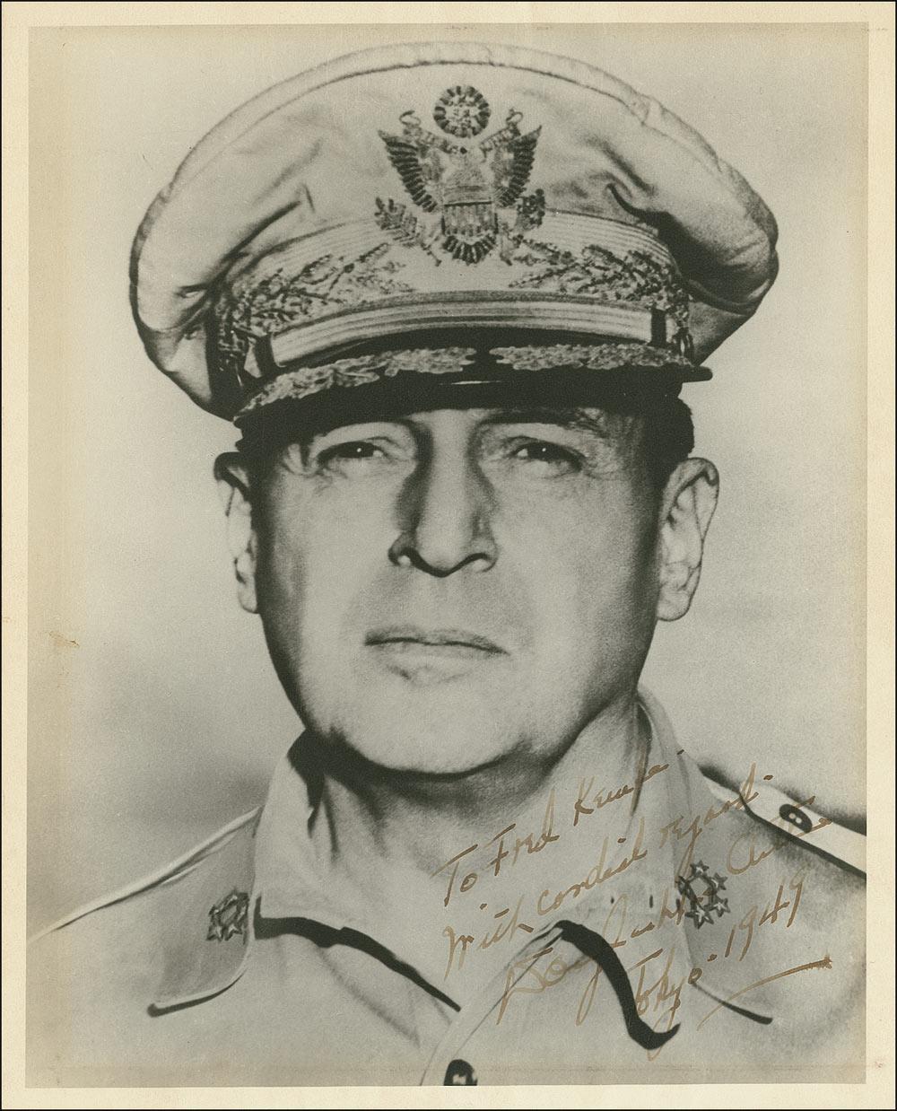 Vintage matte-finish 8 x 10 photo, signed and inscribed in fountain pen “To Fred Kemper, With cordial regard, Douglas MacArthur, Tokyo 1949.” In very good condition, with light rippling and toning to edges, signature and inscription light, but legible, and tape remnants to reverse. Pre-certified PSA/DNA and RRAuction COA.
