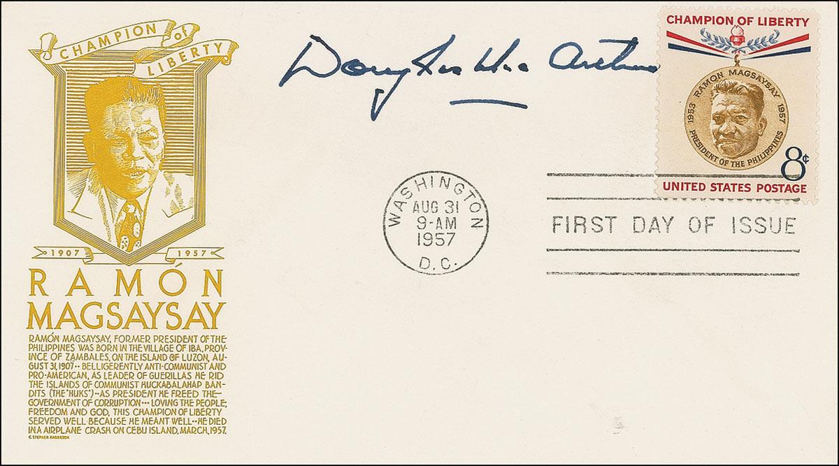 FDC with a cachet honoring Ramon Magsaysay, third president of the Republic of the Philippines, signed in black felt tip by Douglas MacArthur. In fine condition, with light wrinkling.