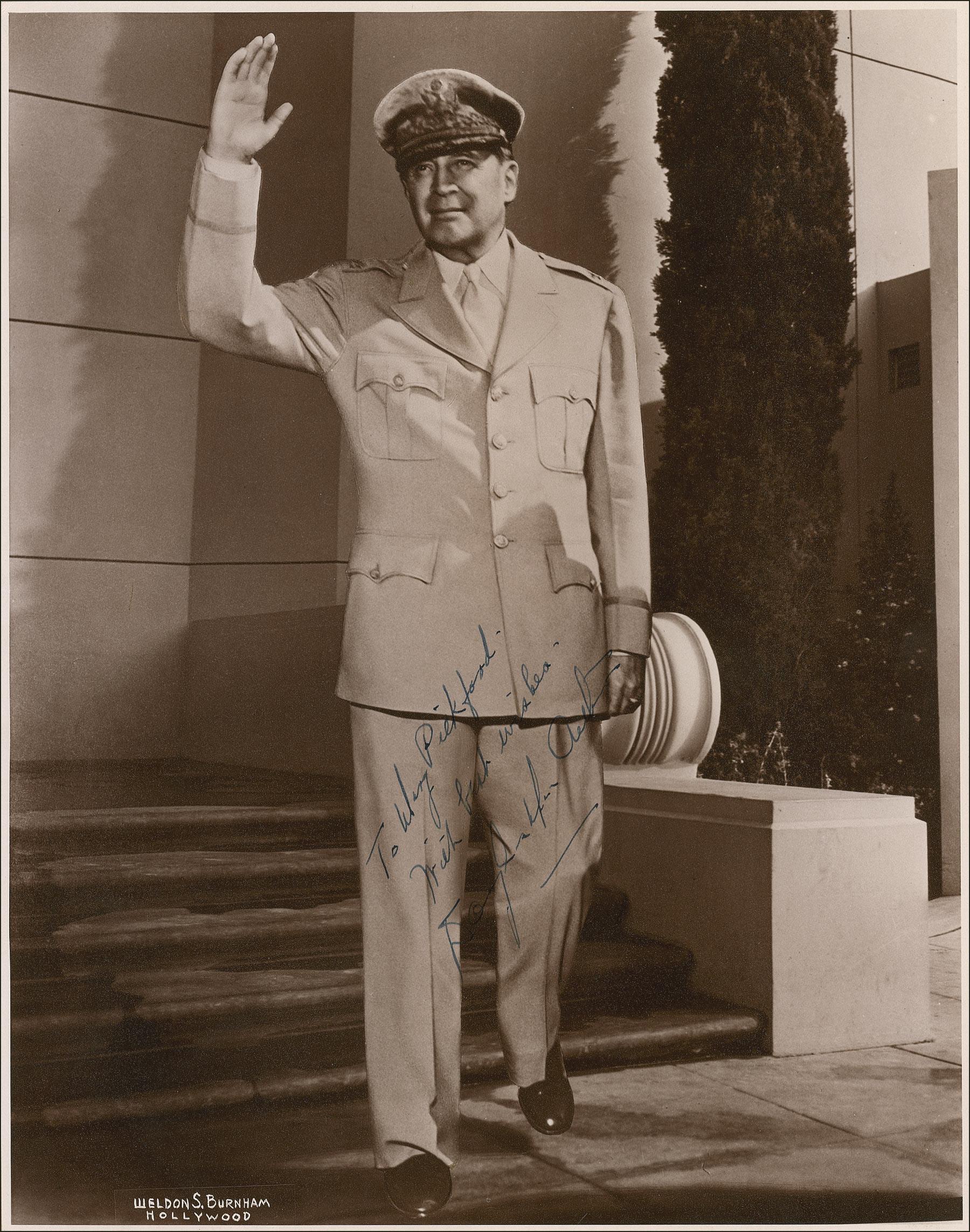 Vintage matte-finish 10.75 x 13.75 photo of MacArthur waving as he descends a small flight of stairs, signed and inscribed in fountain pen “To Mary Pickford, With best wishes, Douglas MacArthur.” Photo is affixed inside its original presentation folder. In fine condition, with a few small surface creases to background.