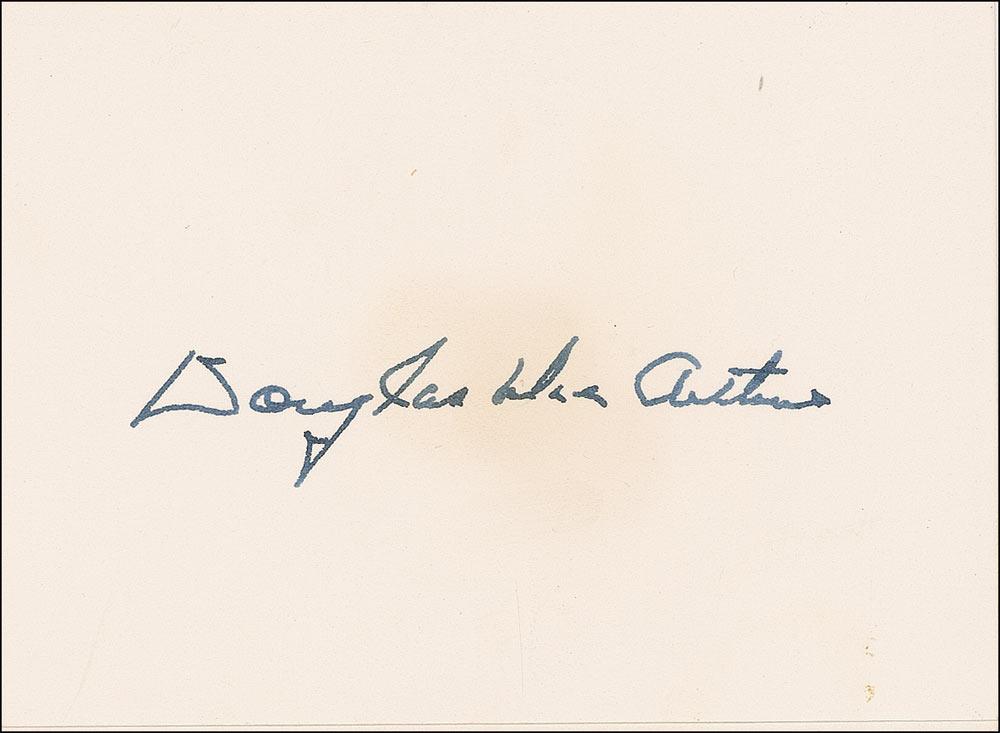 Bold ink signature, “Douglas MacArthur,” on an off-white 4.25 x 3 sheet. In fine condition, with light spot of toning to middle of signature.