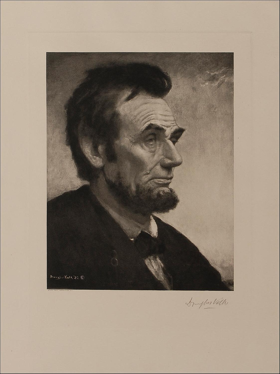 American portrait and landscape painter (1856–1935). Print, 15.25 x 20, depicting Volk’s painting of Abraham Lincoln, signed in pencil “Douglas Volk.” In fine condition, with crease to the upper right edge, ripping, and a few areas of light soiling.