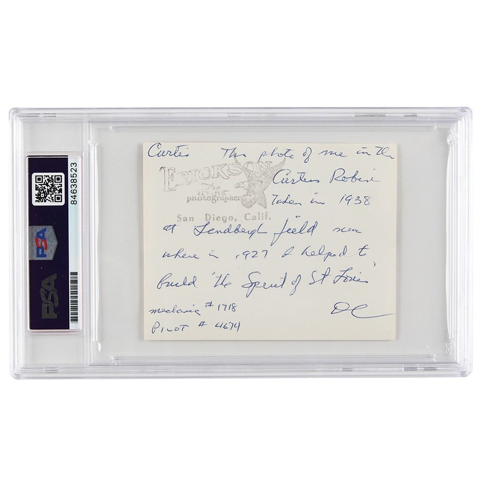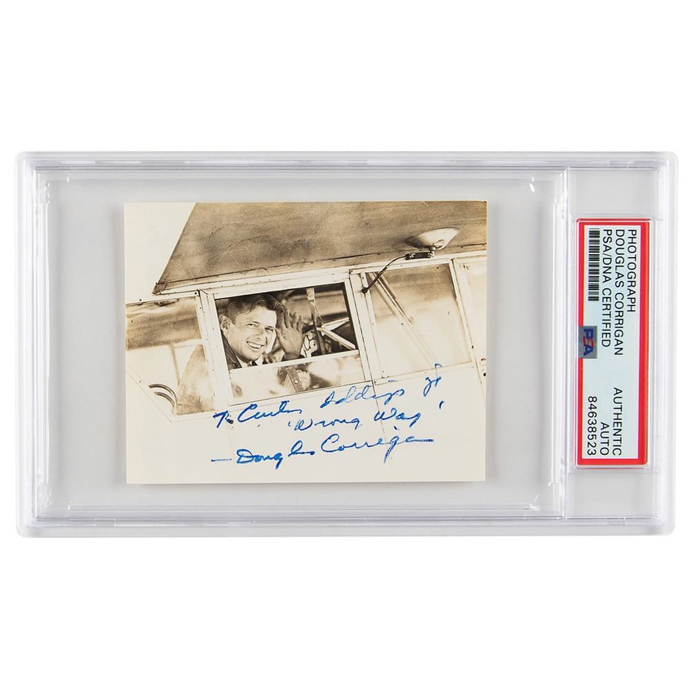 Vintage glossy 4 x 3 photo of Corrigan waving from a plane's cockpit, signed and inscribed in blue ink, "To Curtis Iddings Jr., 'Wrong Way,' Douglas Corrigan," who adds a handwritten note on the back and signs with his initials, "DC." The note reads: "Curtis, The photo of me in the Curtiss Robin taken in 1938 at Lindbergh field near where in 1927 I helped to build 'the Spirit of St. Louis.'†In fine condition, with some light silvering to the darker areas of the image. Encapsulated in a PSA/DNA authentication holder.