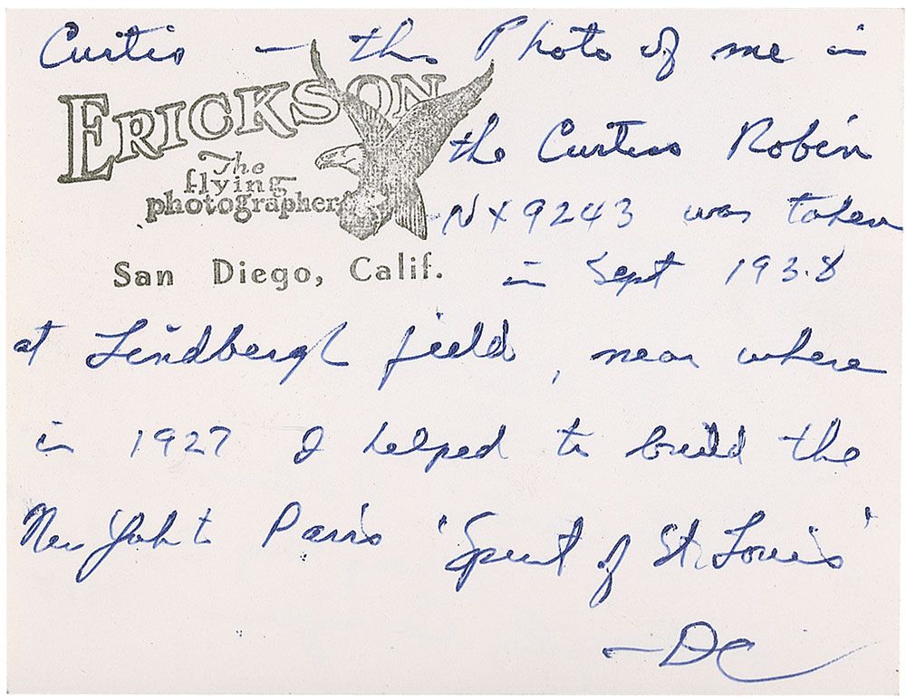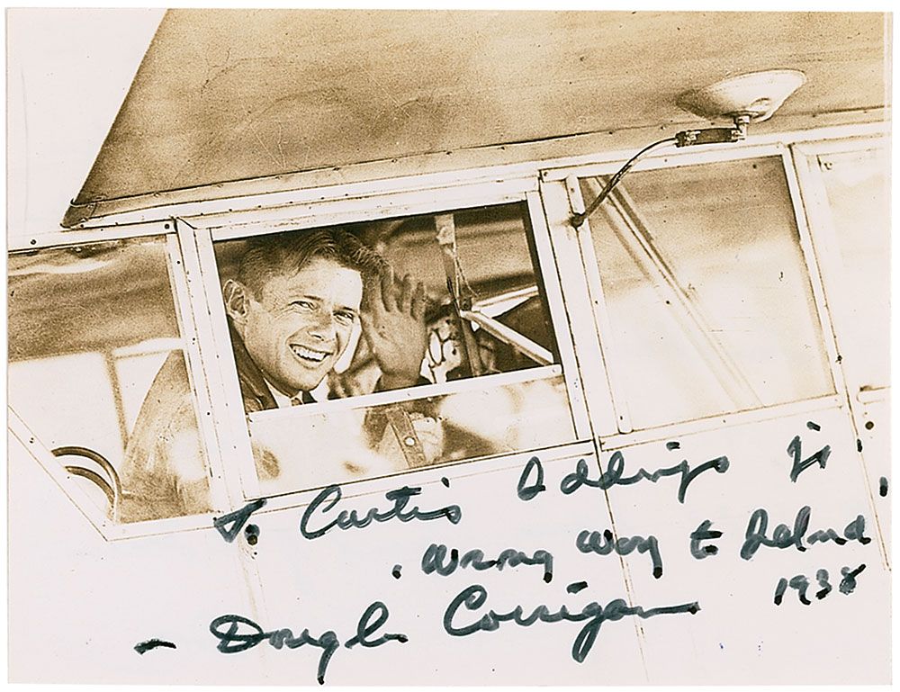 Glossy 4 x 3 photo of Corrigan waving from the cockpit of his plane, signed and inscribed in black felt tip “To Curtis Addings Jr., wrong way to Ireland 1938—Douglas Corrigan.” Corrigan adds a short note on the reverse which reads, “The photo of me in the Curtis Robin…was taken in Sept 1938 at Lindbergh Field, near where in 1927 I helped to build the New York to Paris ‘Spirit of St. Louis. DC.” Silvering to image, visible only at an angle, otherwise fine condition.