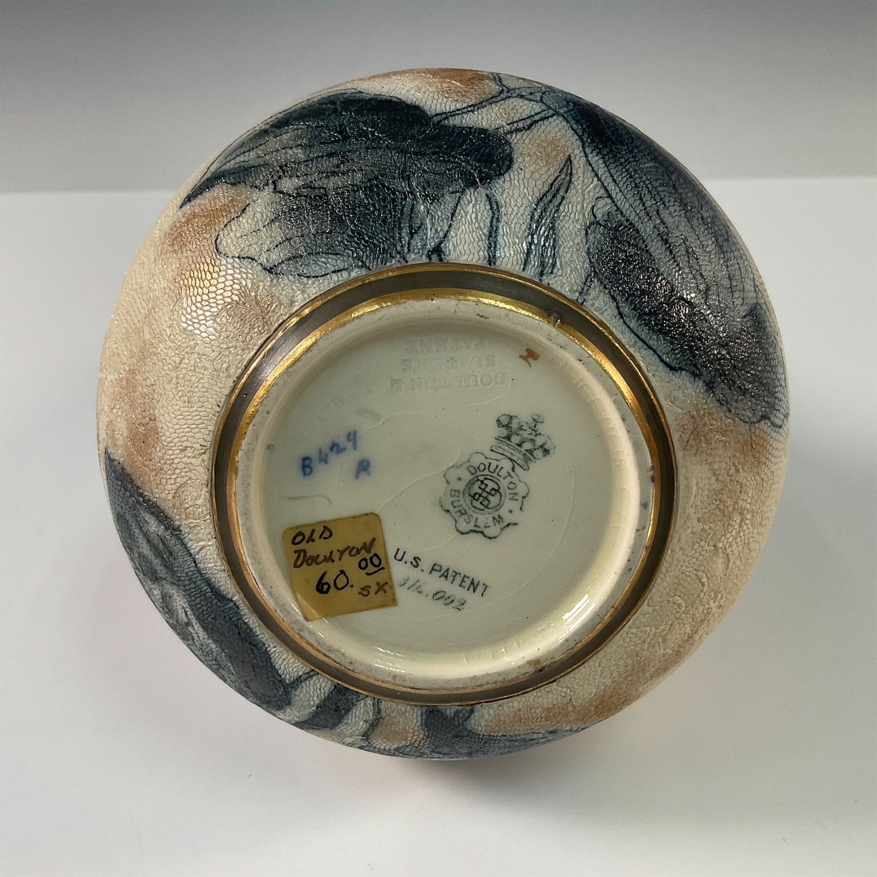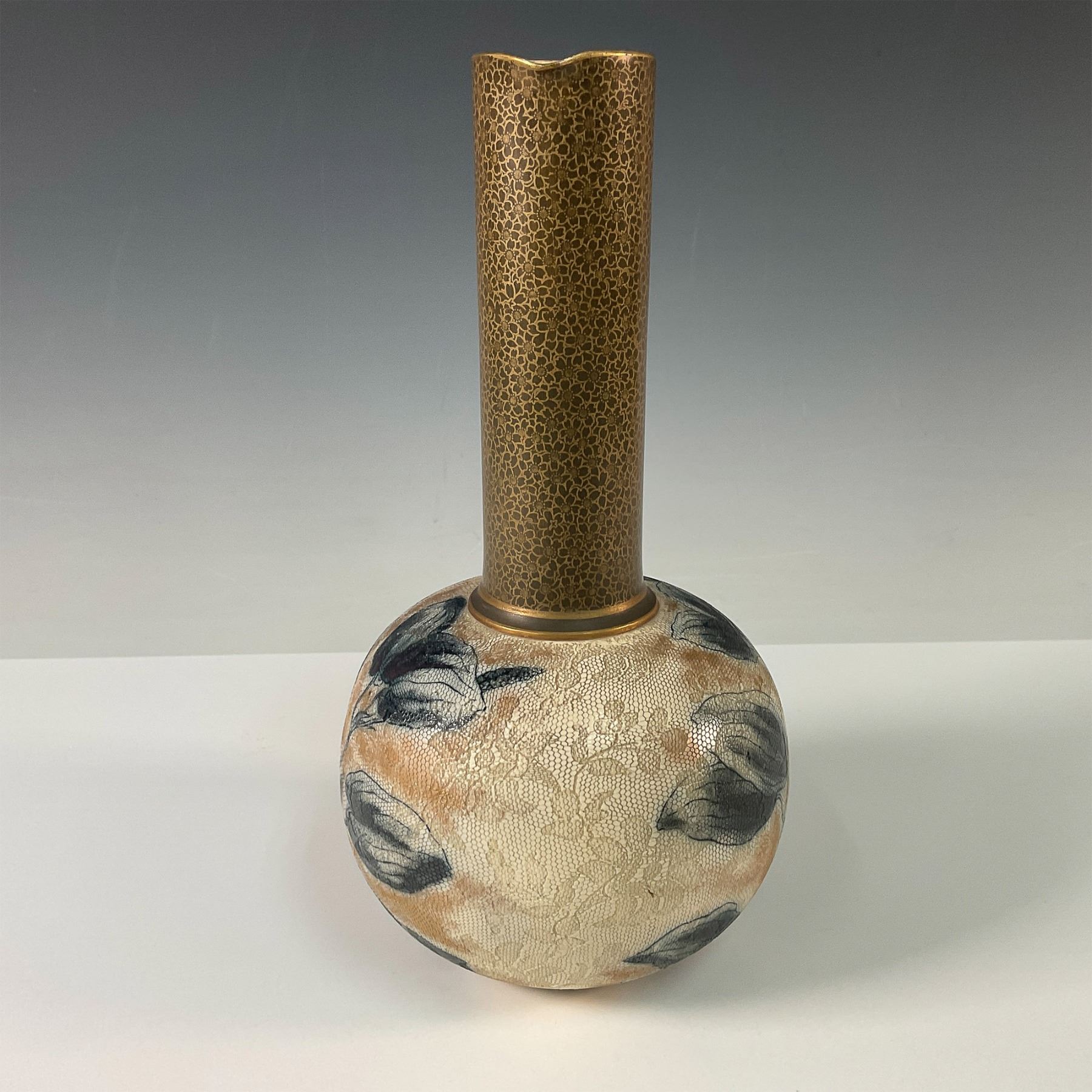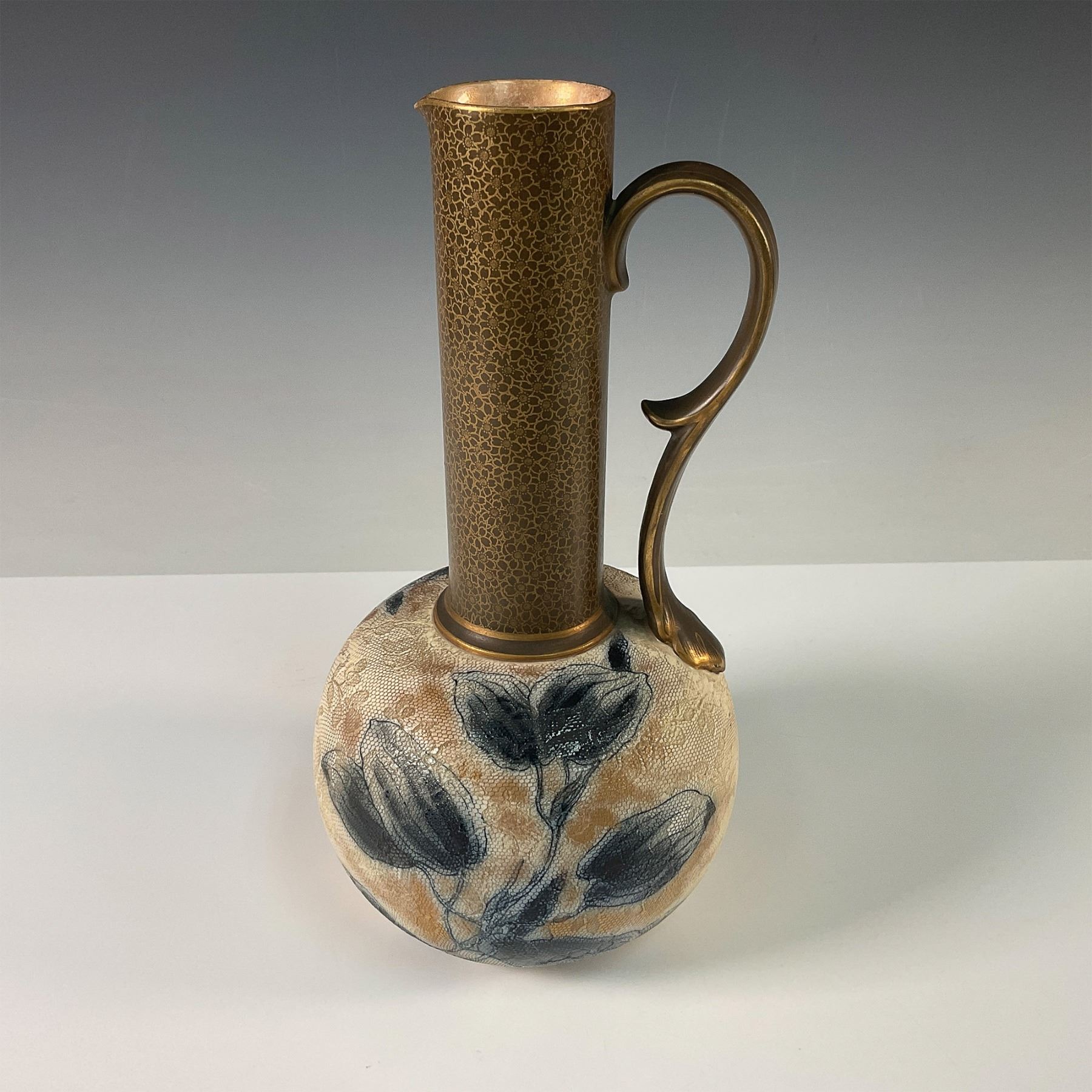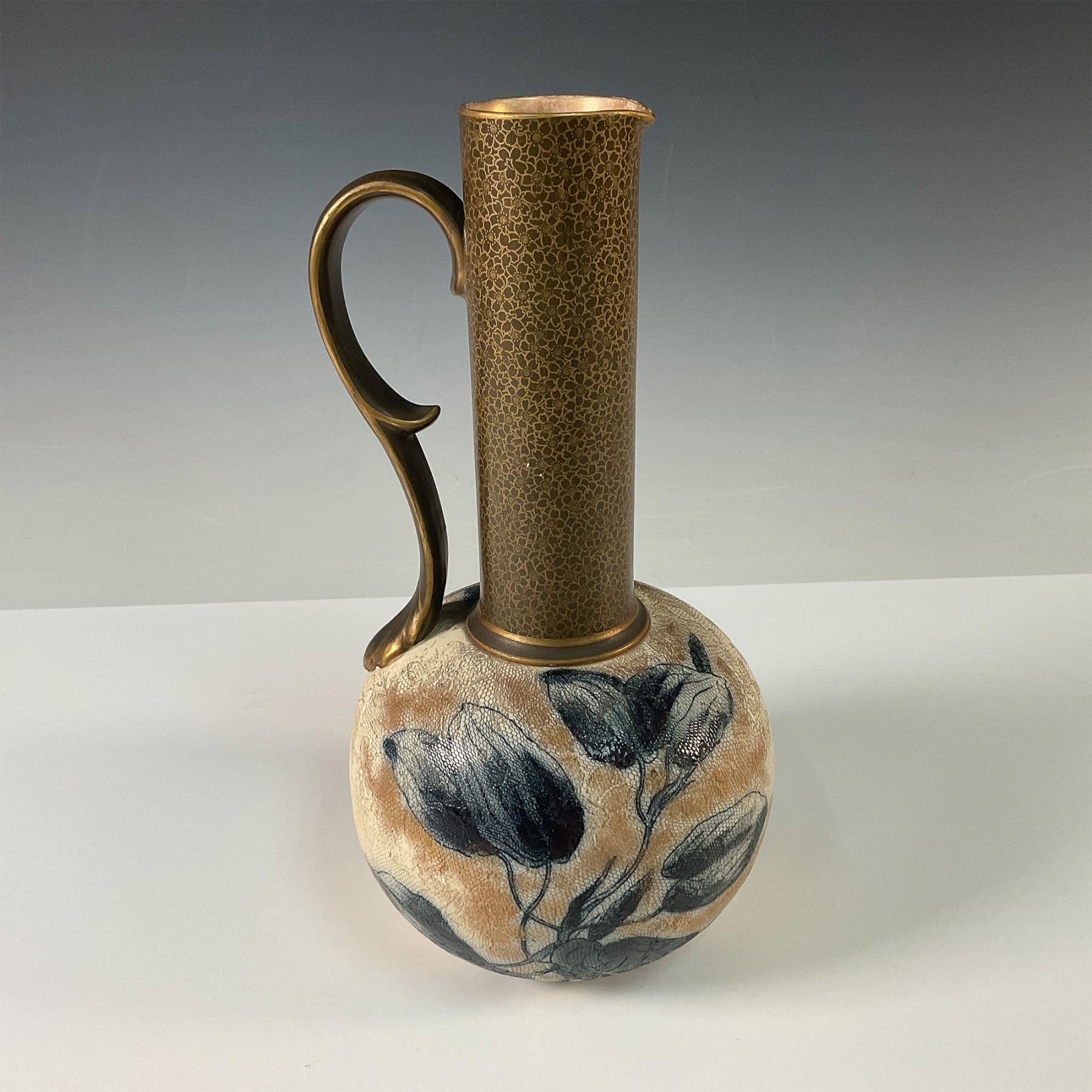 A finely crafted Doulton Burslem Chine Ware jug, showcasing the exquisite artistry and innovative techniques of the Doulton company. The body features a soft cream and beige textured glaze, hand decorated with delicate floral motifs in shades of black and grey, creating an elegant and timeless aesthetic. The slender neck and handle are adorned with a rich gilt floral design, offering a striking contrast to the softer tones of the base. This jug bears the Doulton Burslem backstamp and is marked with the Doulton & Slaters Patent.