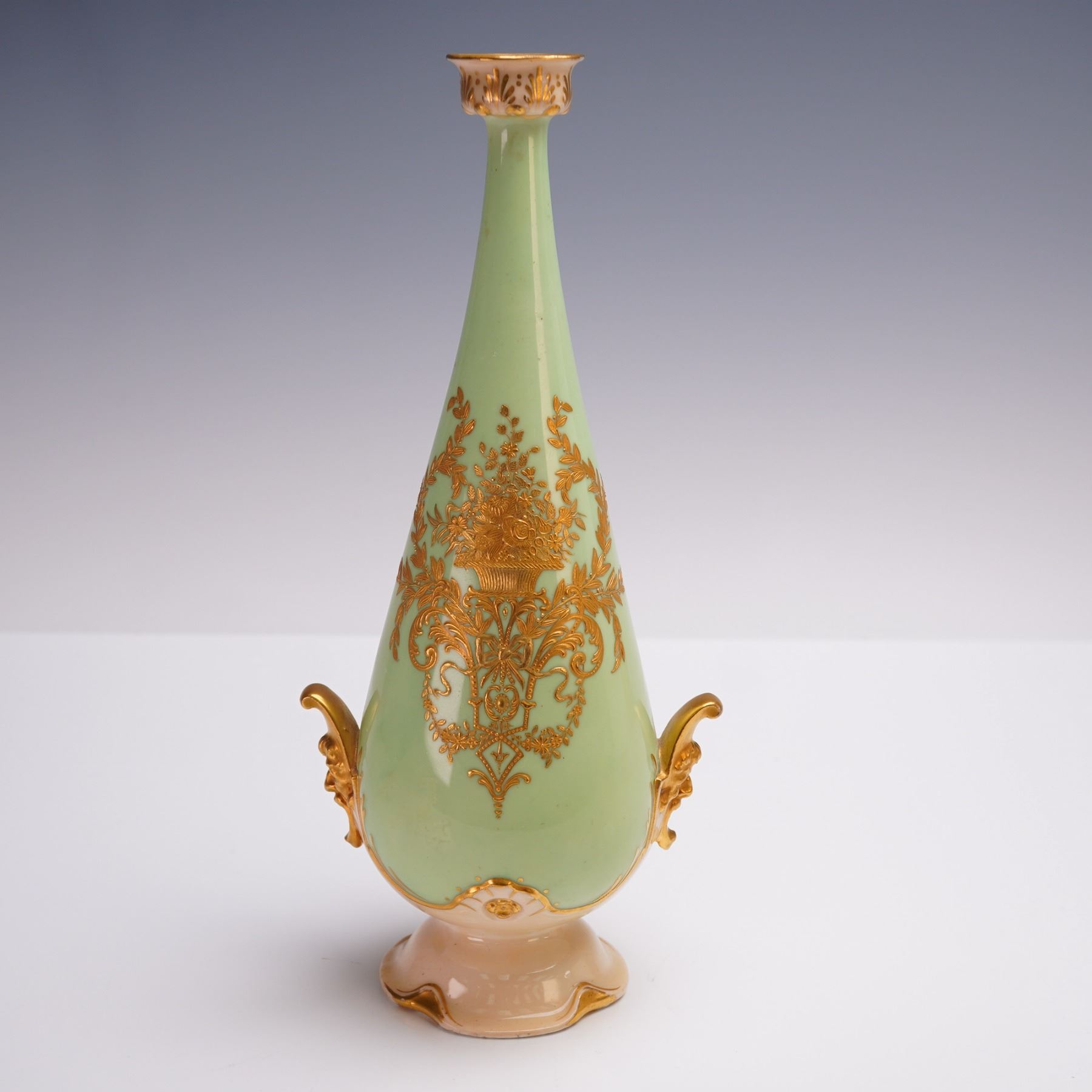 Porcelain vase manufactured by Doulton Burslem, England. This vase features a pale green ground with intricate raised gilt foliate and scrollwork motifs on both sides - one side presenting a symmetrical botanical ribbon design and the opposite side a detailed basket of flowers within an ornate framework. The flared rim is decorated with complementary gold embellishment. The vase is mounted on a cream-colored footed base with scalloped edges and gilt accents. Prominent double handles are applied to the lower sides of the vase, sculpted in the form of stylized classical male faces with open, gaping mouths, functioning as mask handles. These are also highlighted with gilt detailing. The base is stamped in green with the crowned Doulton Burslem backstamp.