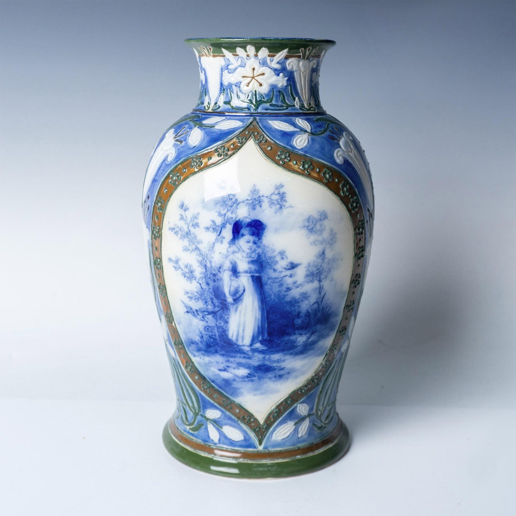 An earthenware vase decorated by Charles Collis incised white flowers in majolica-like glazes. Two panels featuring Girl With Fruit Arm in Arm, and Girl Feeding Birds from the Aesthetic Children seriesware. Doulton Burslem backstamp. Charles Collis signed on the underside.