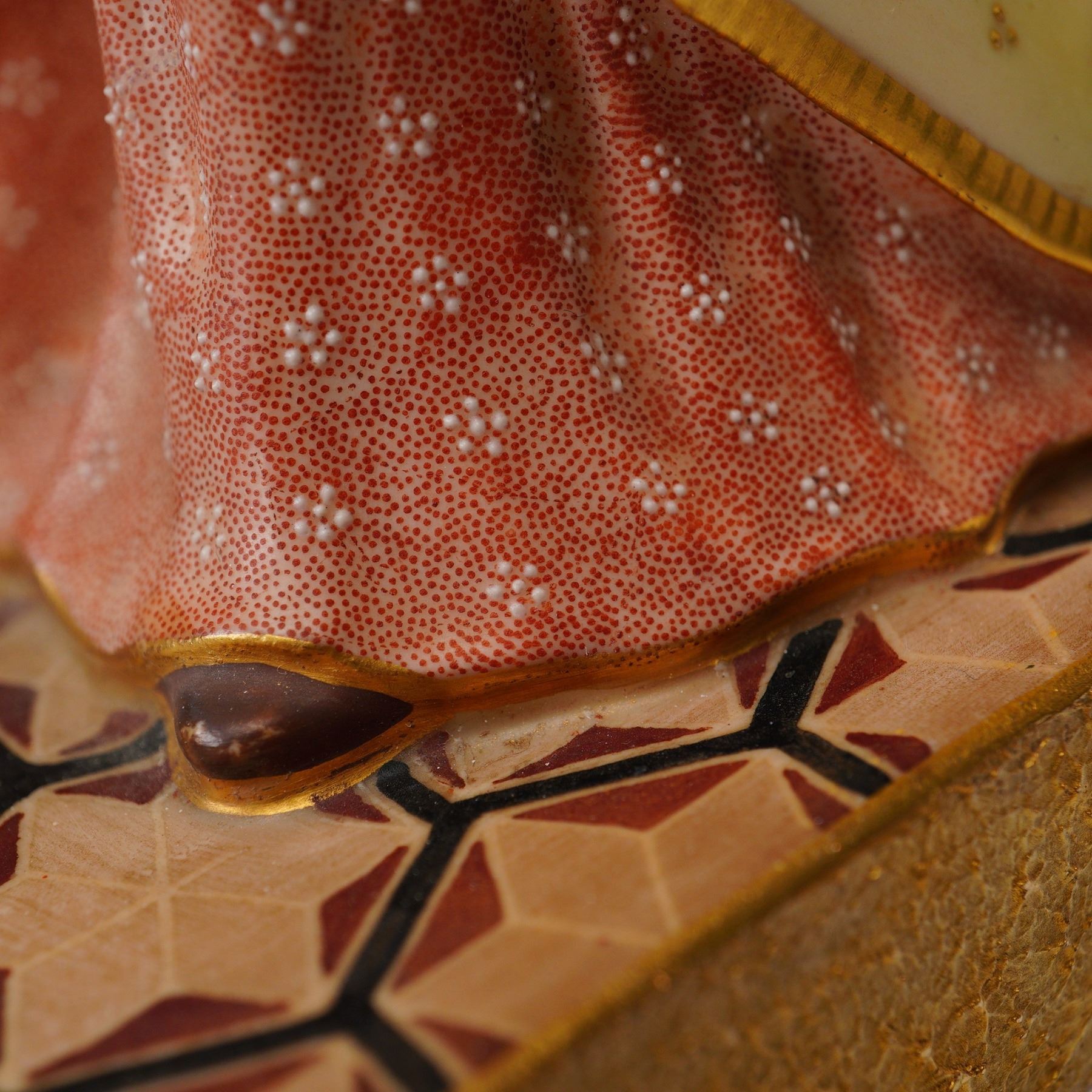 Impressive early figure of Portia, a female protagonist of William Shakespeare's The Merchant of Venice. Modeled in flowing robes adorned with elaborate gilt and enamel decoration, the drapery executed in soft cream tones enriched with gold accents and delicate patterning, standing on a square base with a gilt border. The Vellum figures were made in limited quantities; all can be described as extremely rare. Doulton Burslem backstamp.