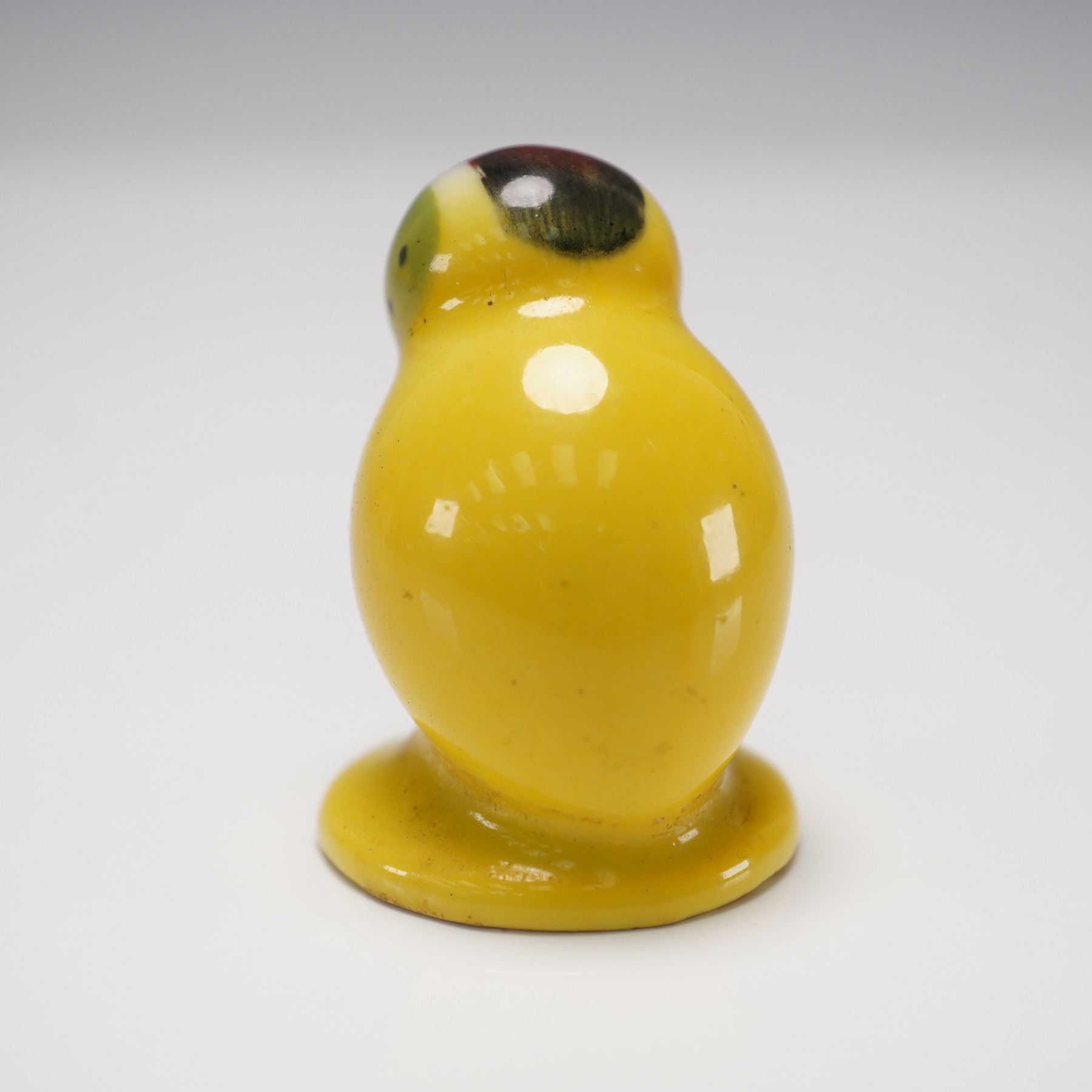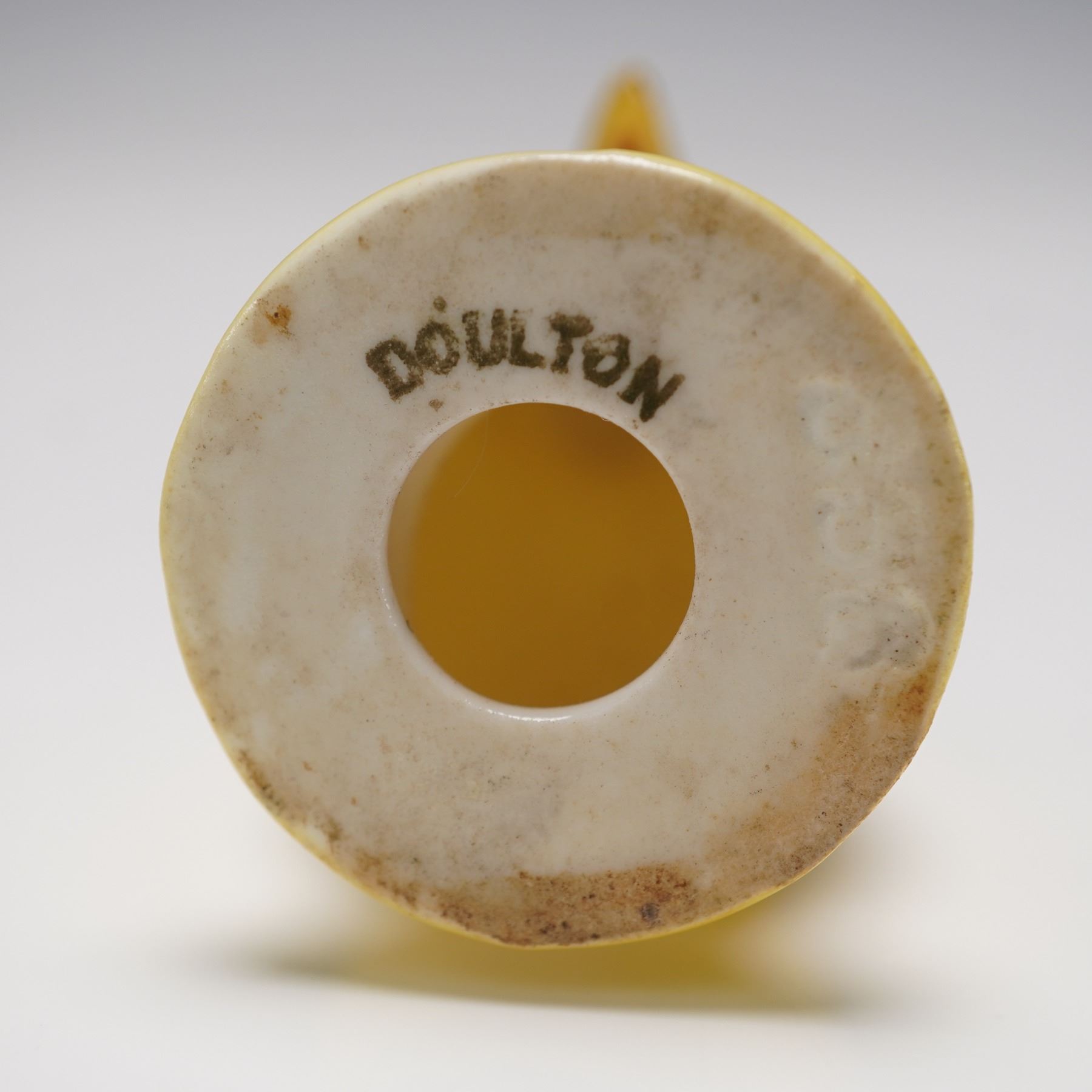 Typically produced in grey and red, this figure presents an alternate colorway featuring a yellow body with a head accented in green, brown, and black. The beak is painted in yellow and red, and the eyes are detailed in yellow and black. The underside is marked DOULTON and the model number 336.