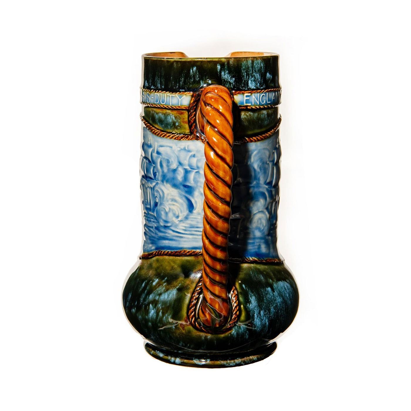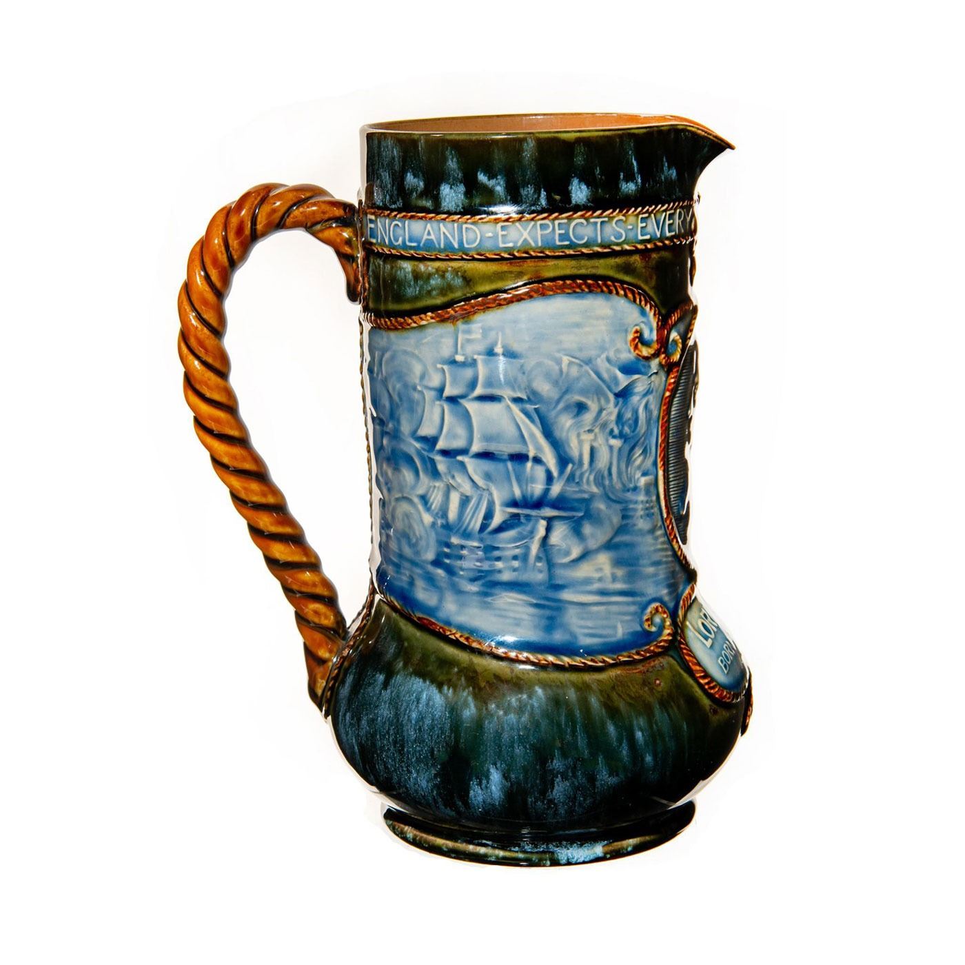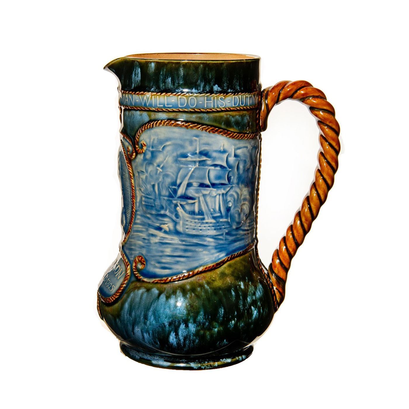 Features portrait of Lord Nelson and scene of ships at sea encircling body. Cobalt blue and green glaze; brown twisted rope handle. The inscription on body reads, ENGLAND EXPECTS EVERY MAN WILL DO HIS DUTY. Royal Doulton impressed backstamp. Professional restoration to handle.