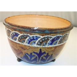 Doulton Lambeth art pottery jardiniŠre on triple scroll supports, the body decorated with blue acanthus leaves on a mottled brown ground, geometric and beaded border, monogram for Edith D. Lupton, 28cms diameter